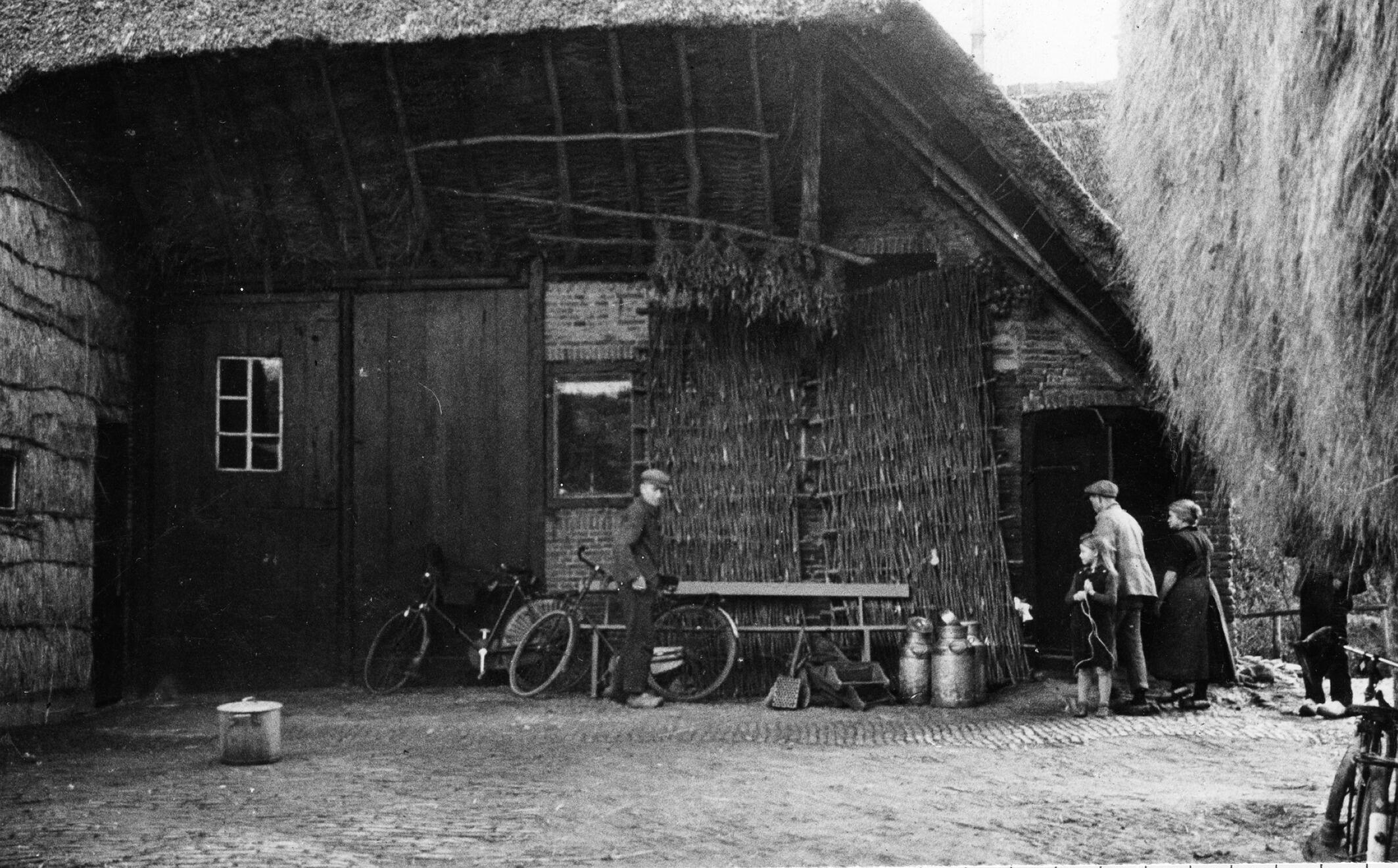 Achtergevel met overstek van een boerderij aan de Flegelstraat 1 in het Gelderse Brakel, in de Bommelerwaard. Onder het overstek staan mensen, fietsen, melkbussen en rietdekkersgereedschap.