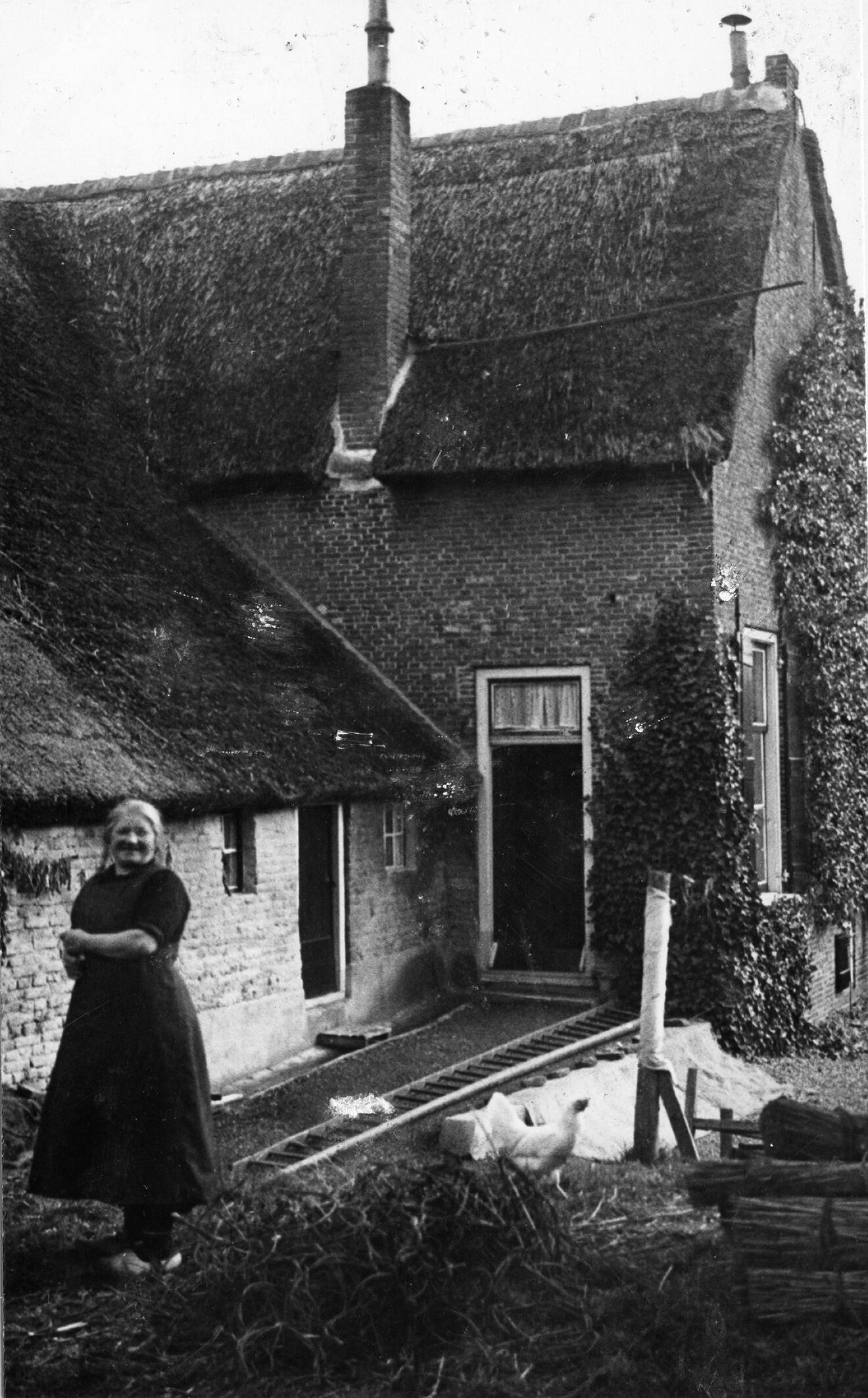 Een T-boerderij aan de Flegelstraat 1 in het Gelderse Brakel, in de Bommelerwaard. Rechts is het dwarshuis te zien. Op de voorgrond staat een vrouw. Op de grond ligt een ladder.
