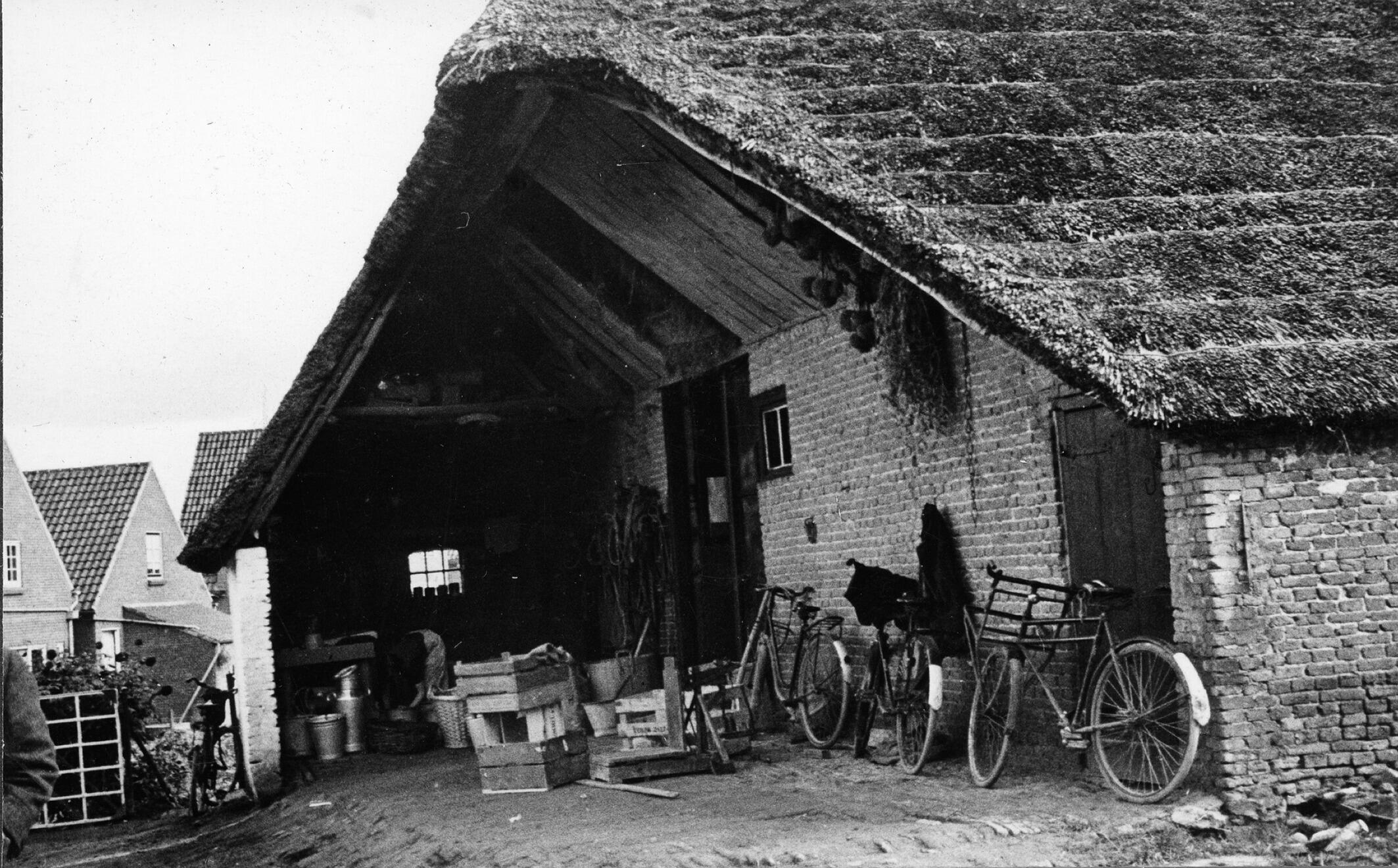 Overstek aan de achtergevel van een boerderij in het Gelderse Brakel, in de Bommelerwaard. Onder de overstek staan fietsen, kratten en melkbussen.