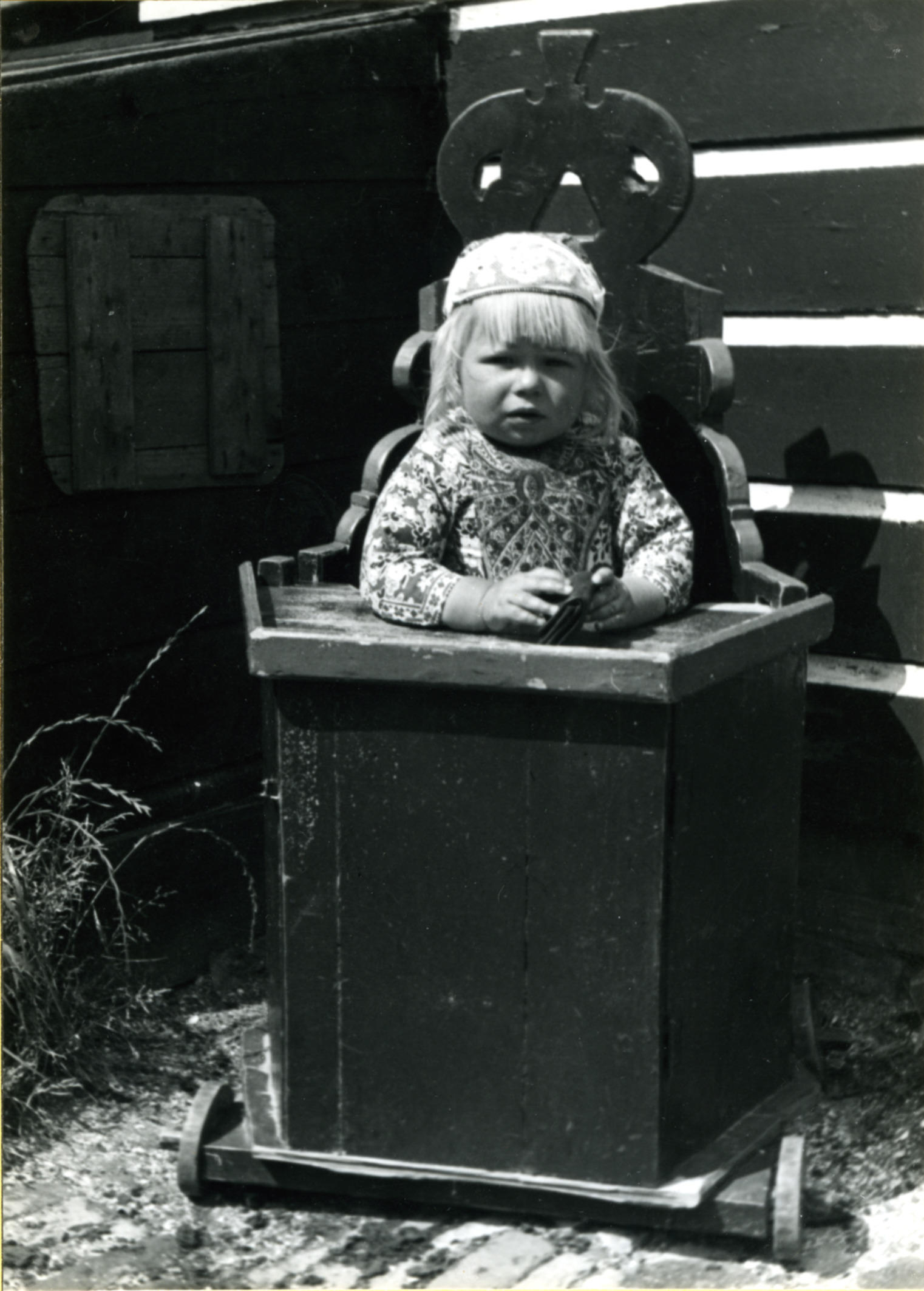 Meisje in Marker streekdracht in een geschilderde houten kakstoel op wieltjes.