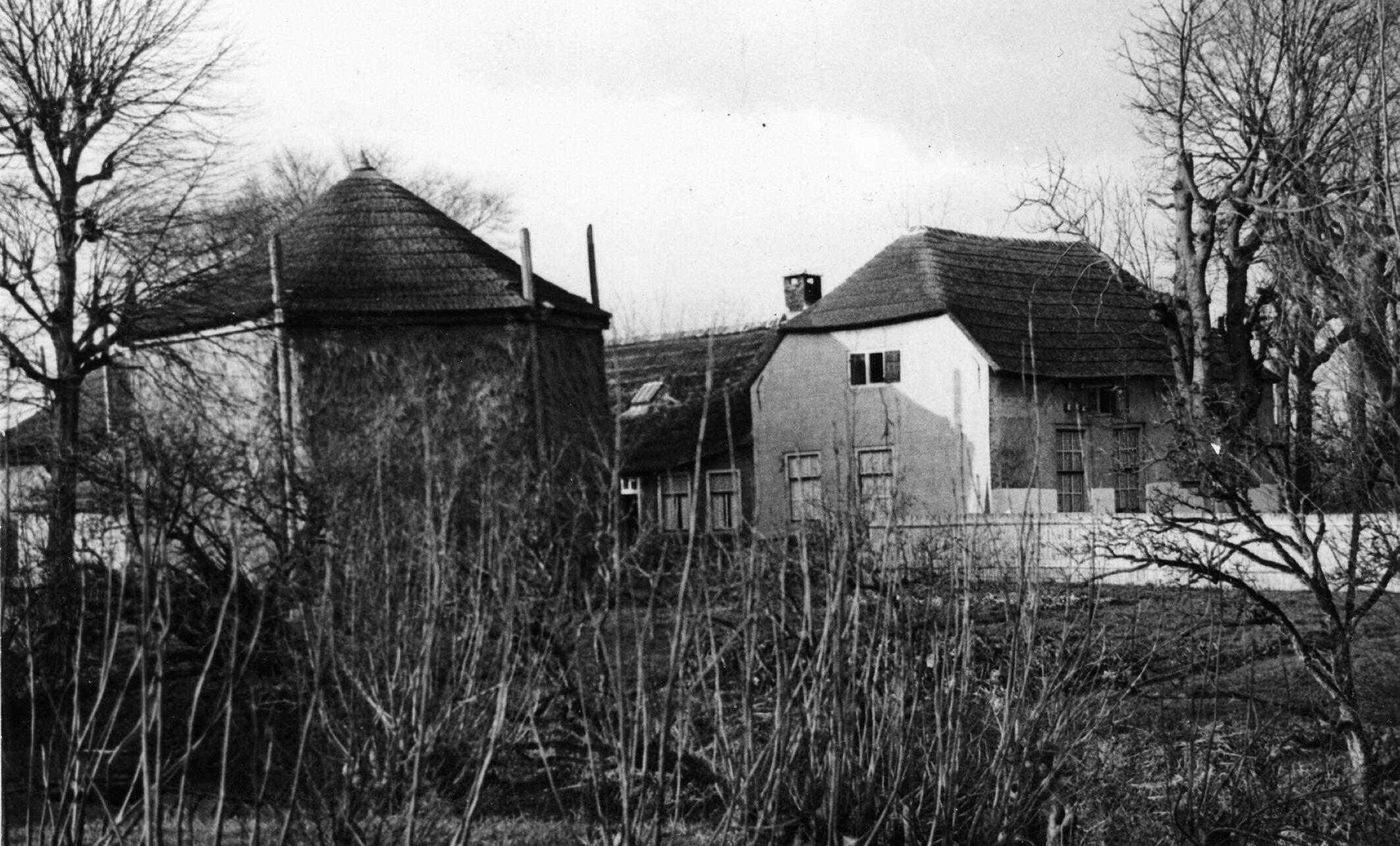 Zij- en voorgevel van een boerderij aan de Abtswoudseweg 42 in Schipluiden (tegenwoordig Delft), met links een hooiberg en rechts het woonhuis.