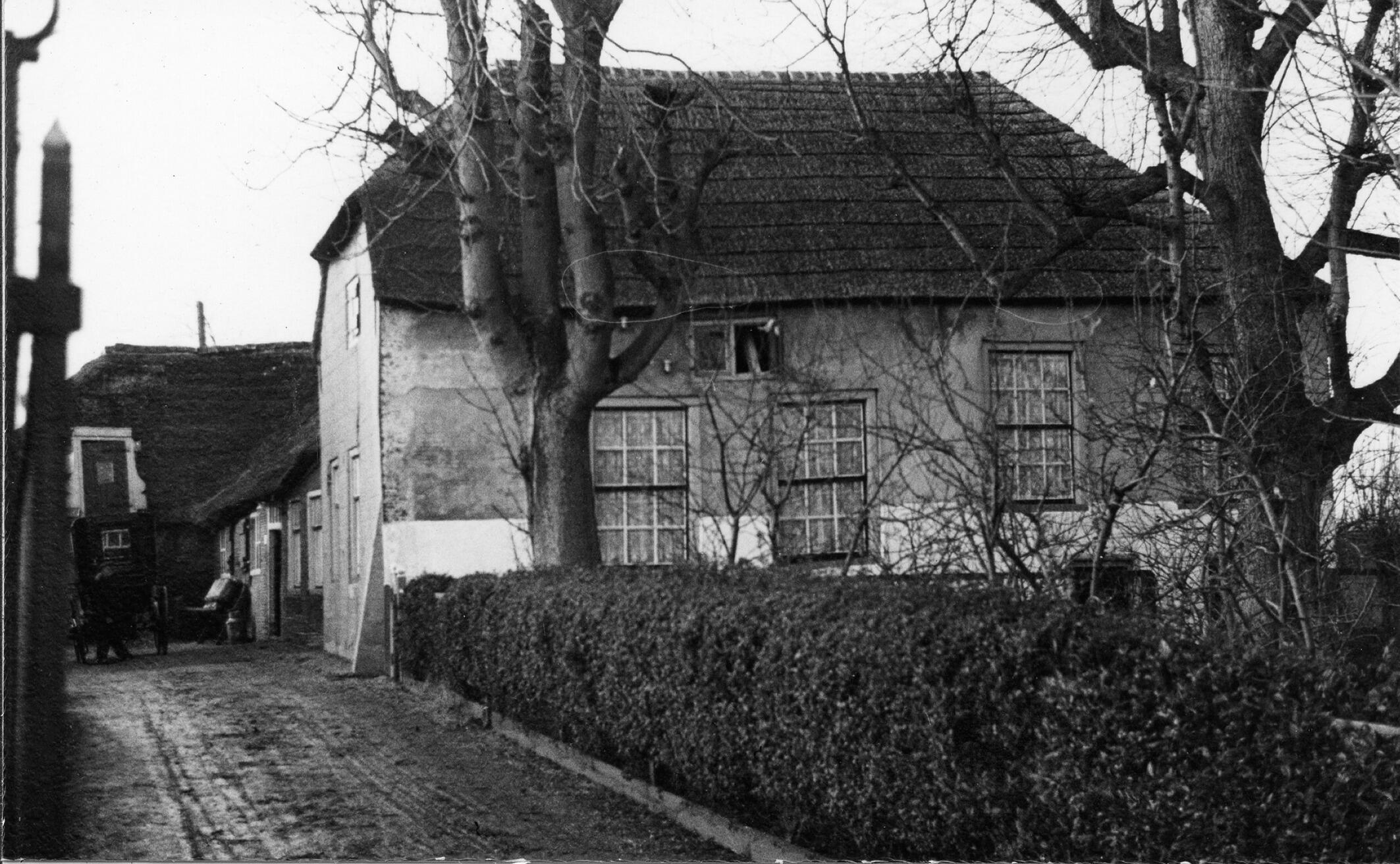 Toegangsweg van een boerderij aan de Abtswoudseweg 42 in Schipluiden (tegenwoordig Delft), met links een schuur en rechts het woonhuis.