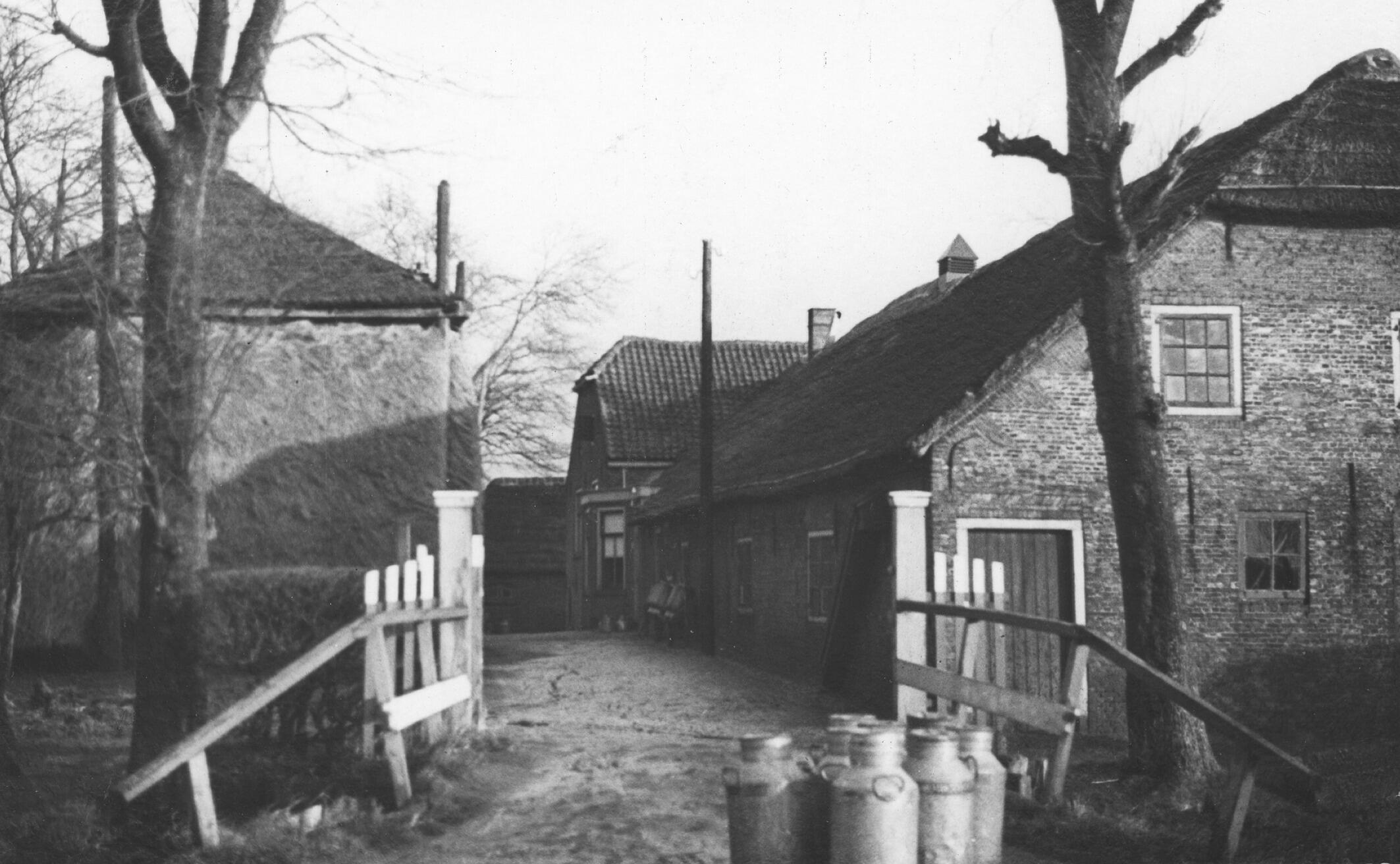 Toegangsweg met een loopbrug over een sloot van een boerderij in Schipluiden, nabij Delft. Links is een hooiberg en rechts de schuur. Op de toegangsweg staan melkbussen.