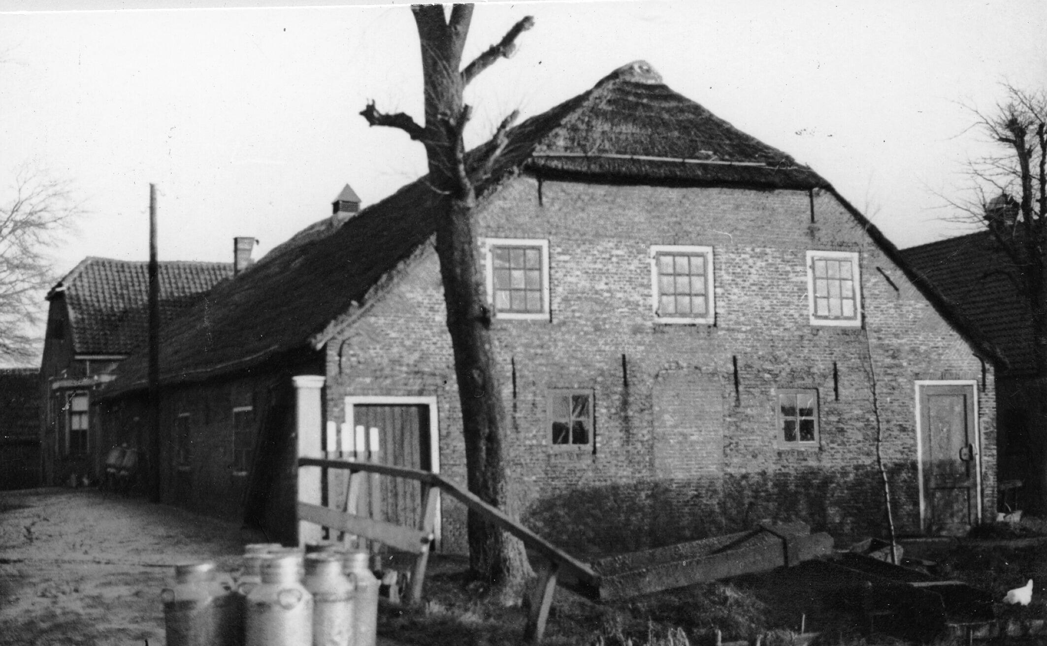 Zij- en voorgevel van een boerderij in Schipluiden, nabij Delft. Op de toegangsweg staan melkbussen.