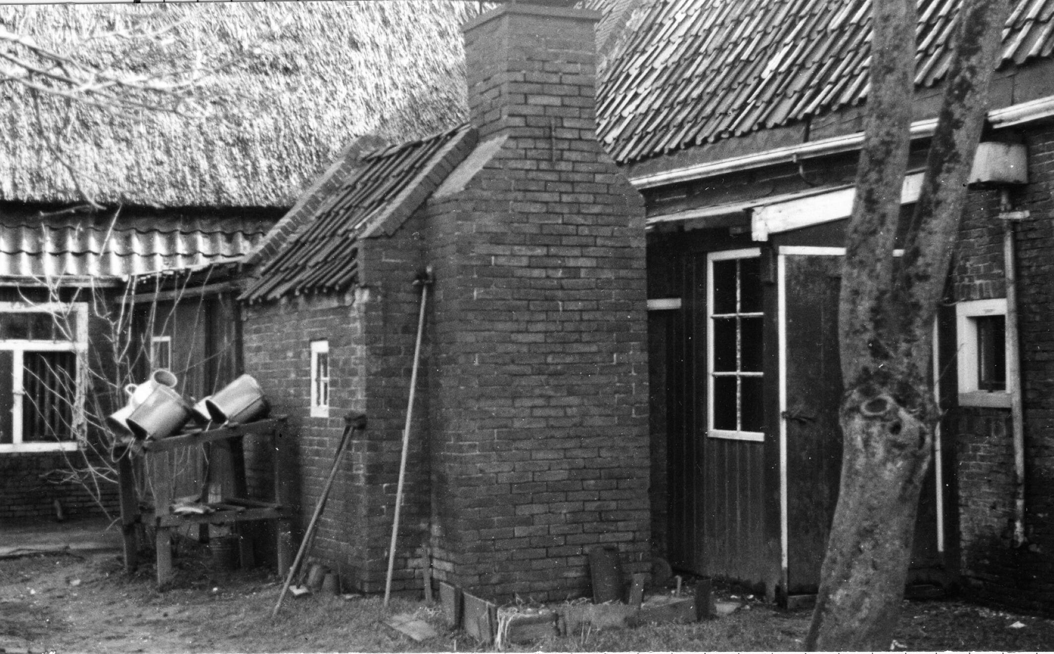 Een bakhuis of stookhut met een grote schoorsteen naast een boerderij in het Friese Engwierum. Naast de stookhut staat een emmerrek.