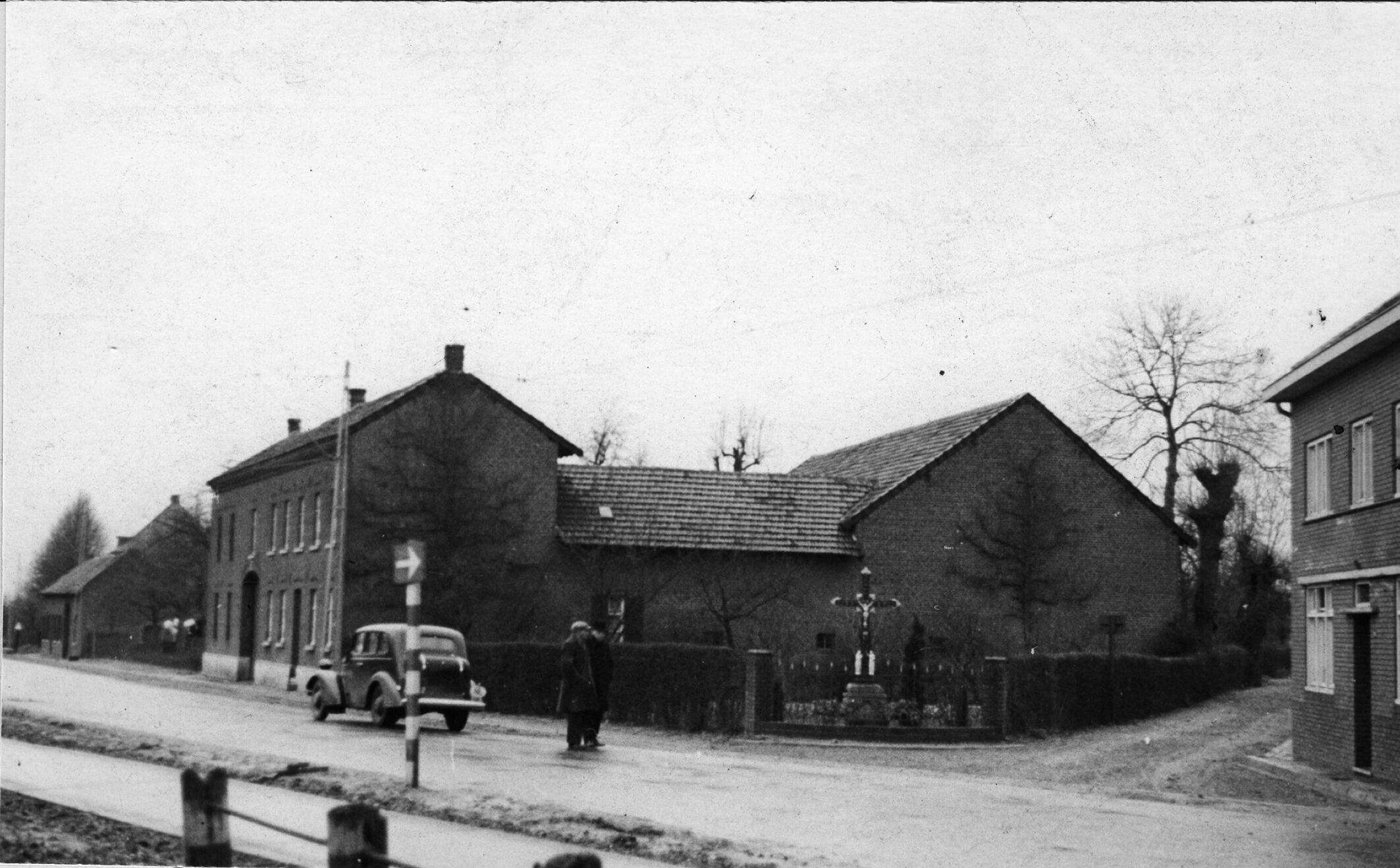 Vierkantshoeve in het Limburgse Oirsbeek. Op de hoek van de straat staat een kruisbeeld. Op de weg zijn een auto en twee mannen te zien.