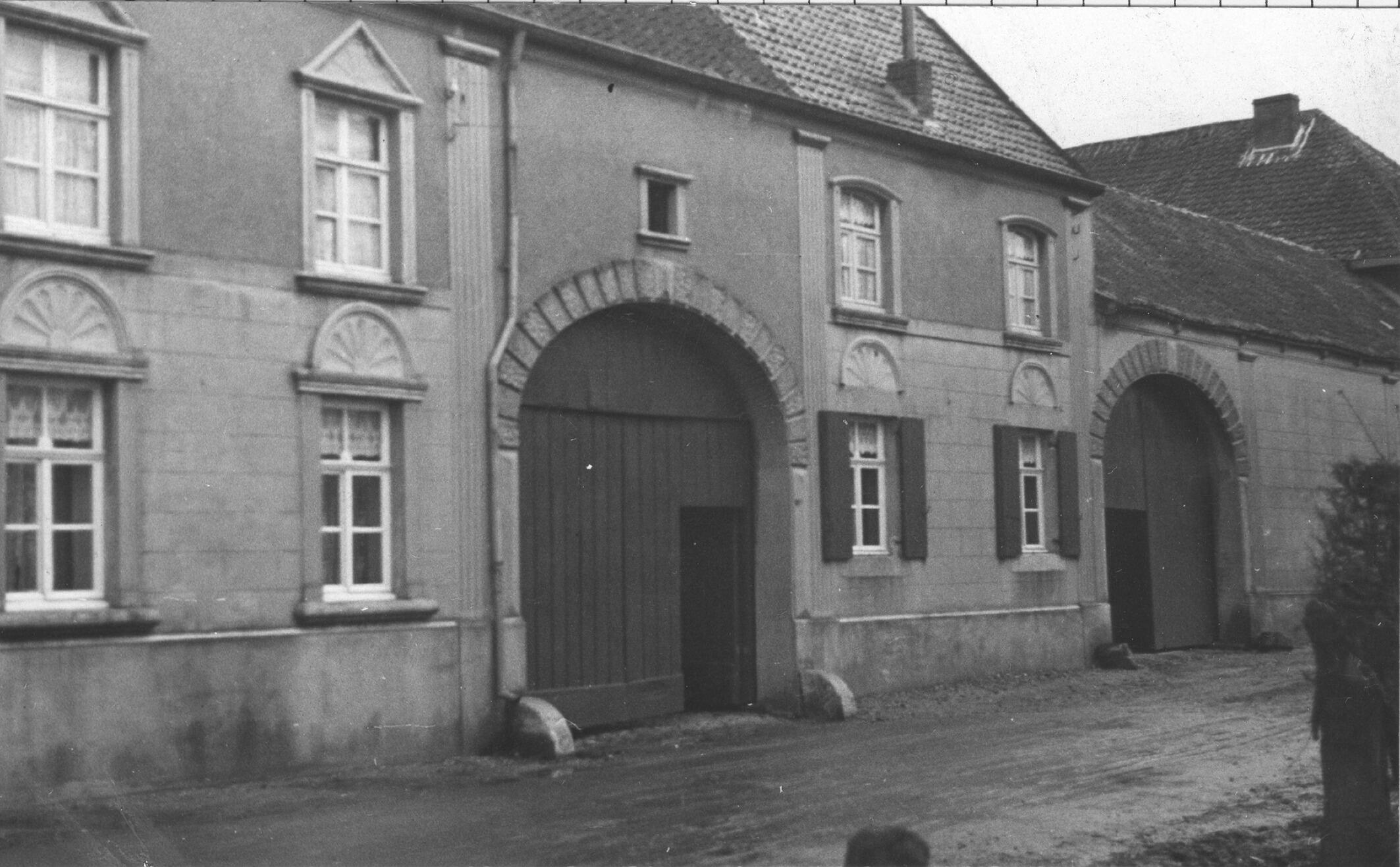 Voorgevel van een boerderij in het Limburgse Oirsbeek, met twee inrijpoorten en schelpvormige ornamenten boven de ramen.