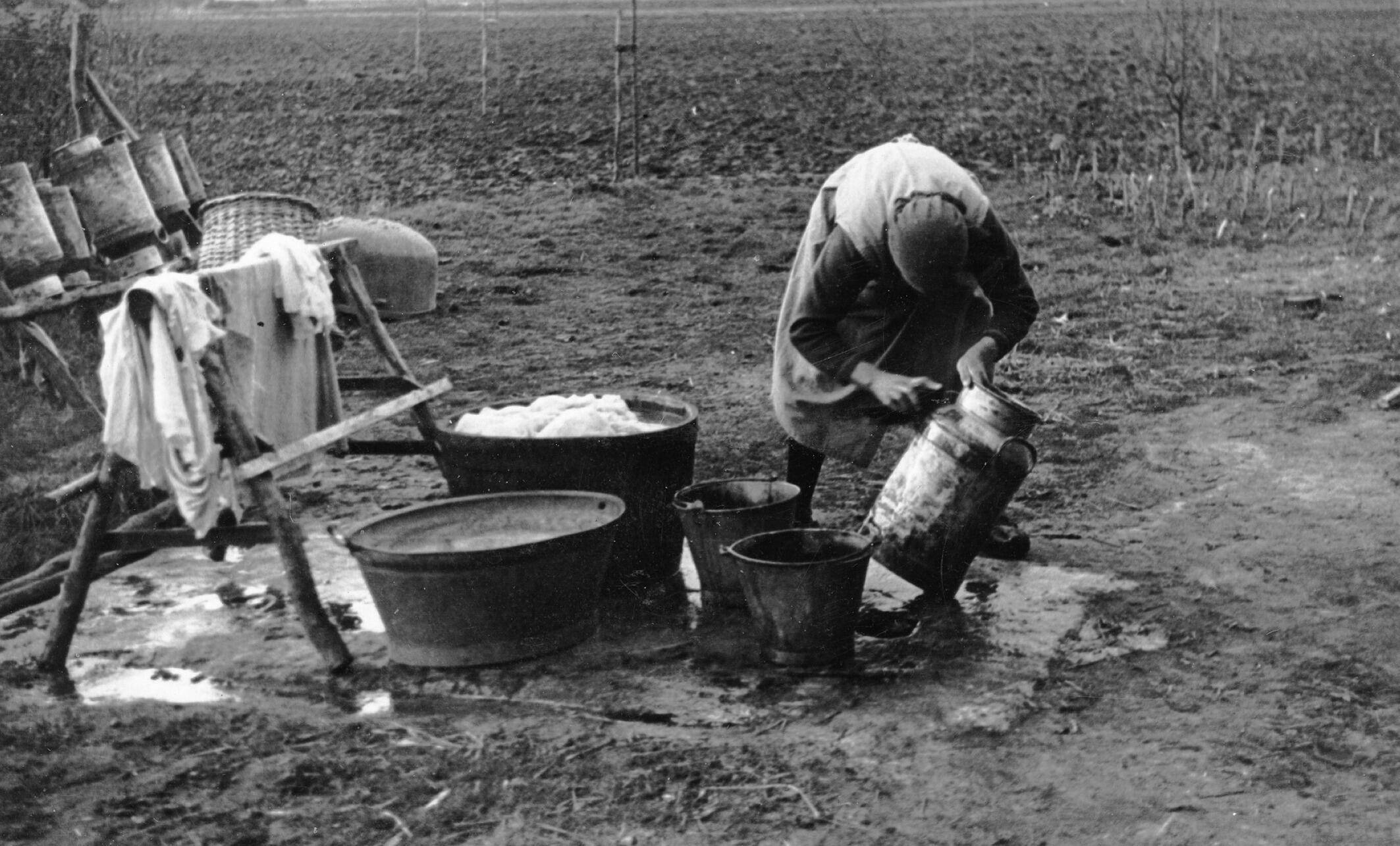 Wassen van melkbussen op een spoelplaats, Asten, 1937 (zwart-wit foto)