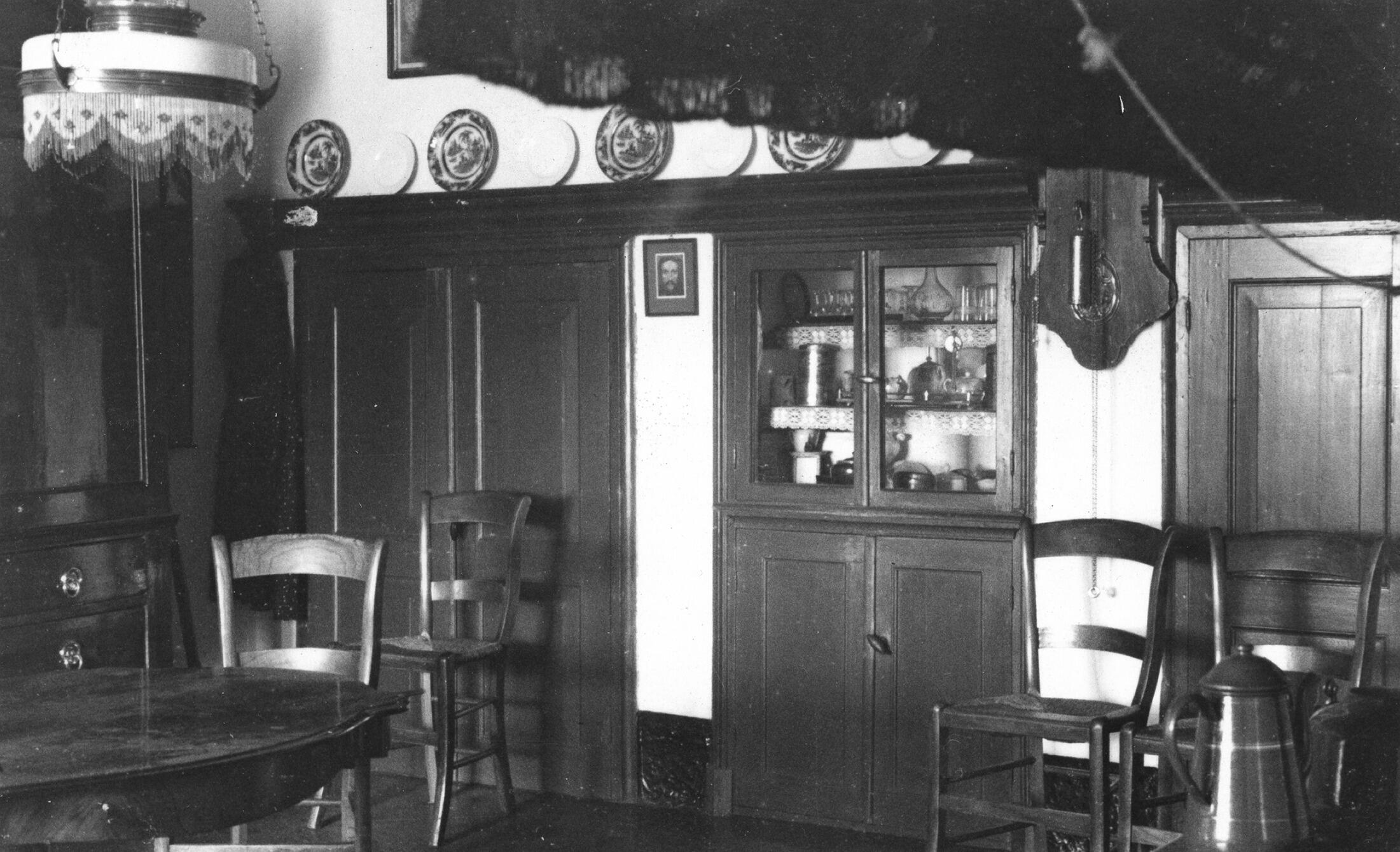 Keukeninterieur van een boerderij in het Gelderse Loenen, met een tafel, stoelen, diverse kasten, een hanglamp en decoratieve wandborden. Centraal hangt een klein portret van een man. Rechtsonder staat een koffie- of theepot.