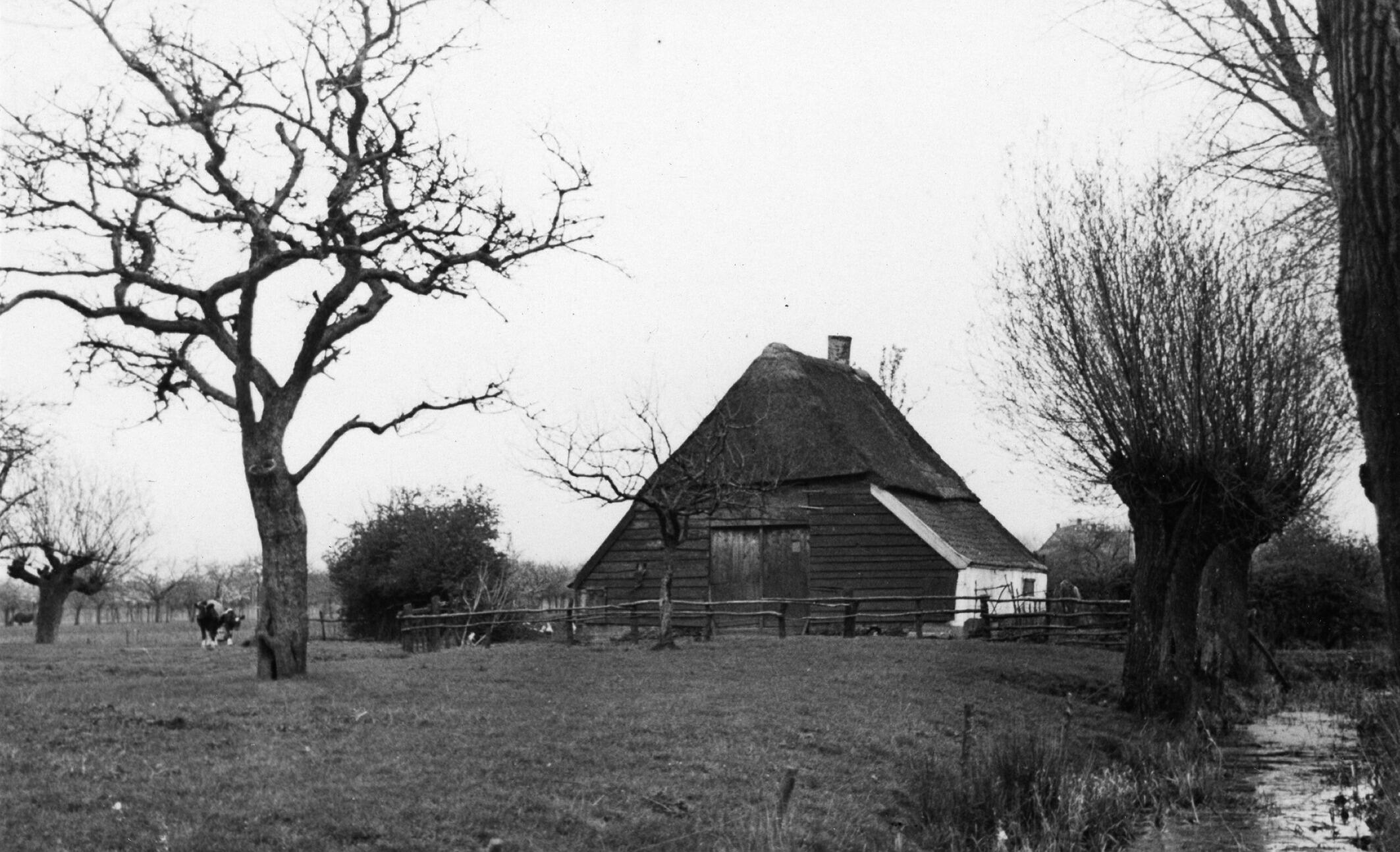 Achtergevel van hallenhuisboerderij De Krommendijk aan de Boterhoeksestraat in Heteren, met links koeien in de wei en rechts een sloot..