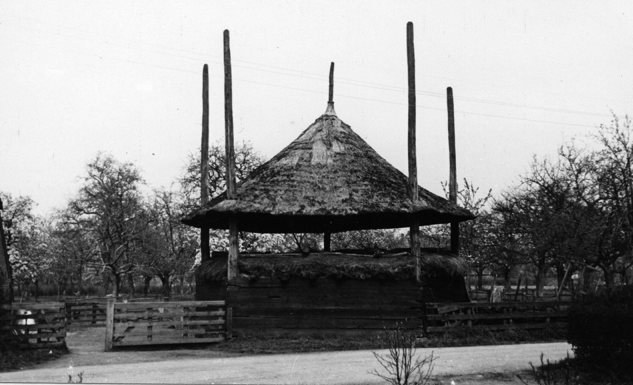 Schuurberg voor de opslag van hooi met een in hoogte verstelbaar dak op vijf roeden in het Gelderse Randwijk, met daarnaast een toegangshek.