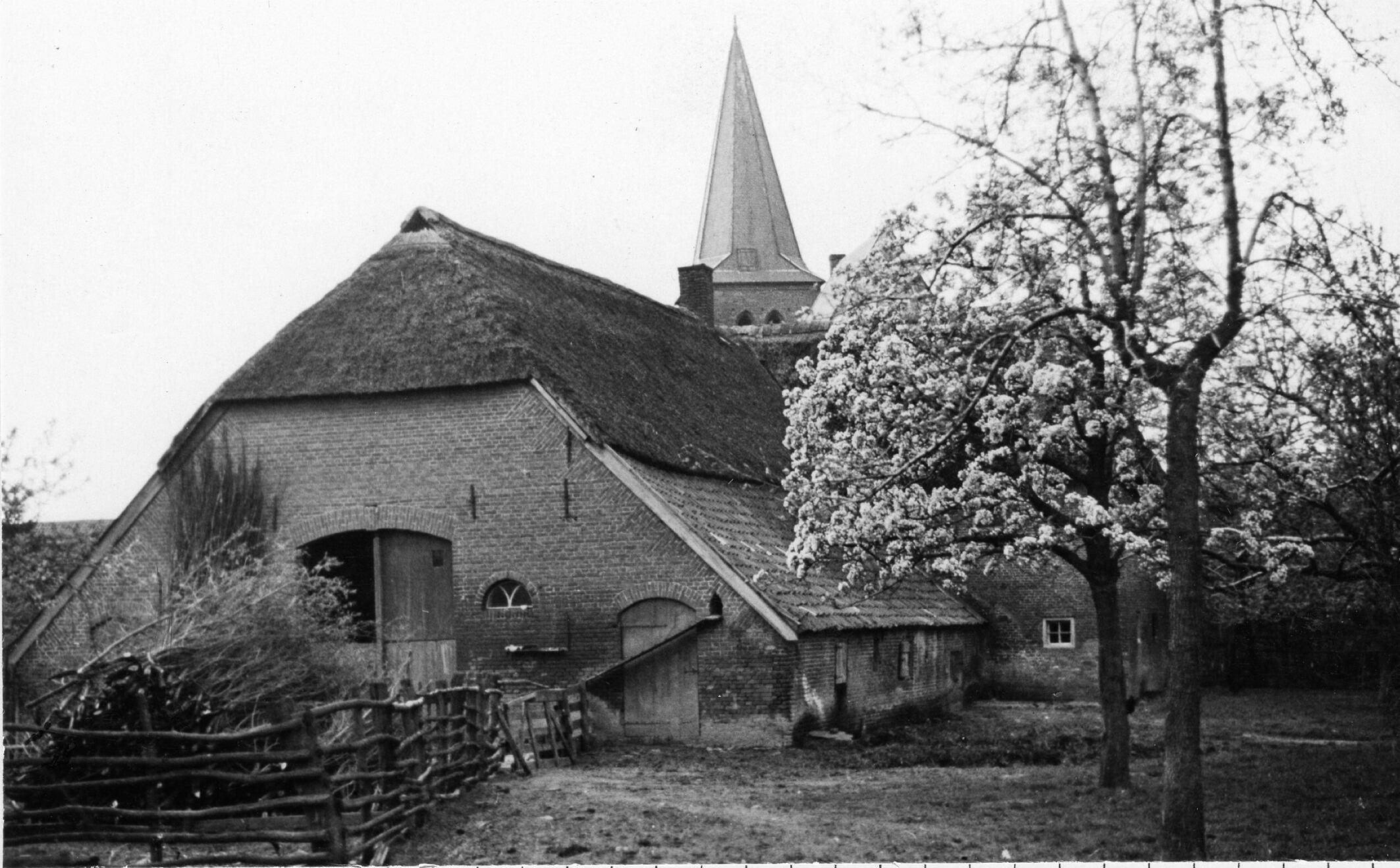 Achter- en zijgevel van een T-boerderij in het Gelderse Randwijk. Achter de boerderij is de kerktoren van de hervormde kerk te zien. Voor de schuur liggen takkenbossen.