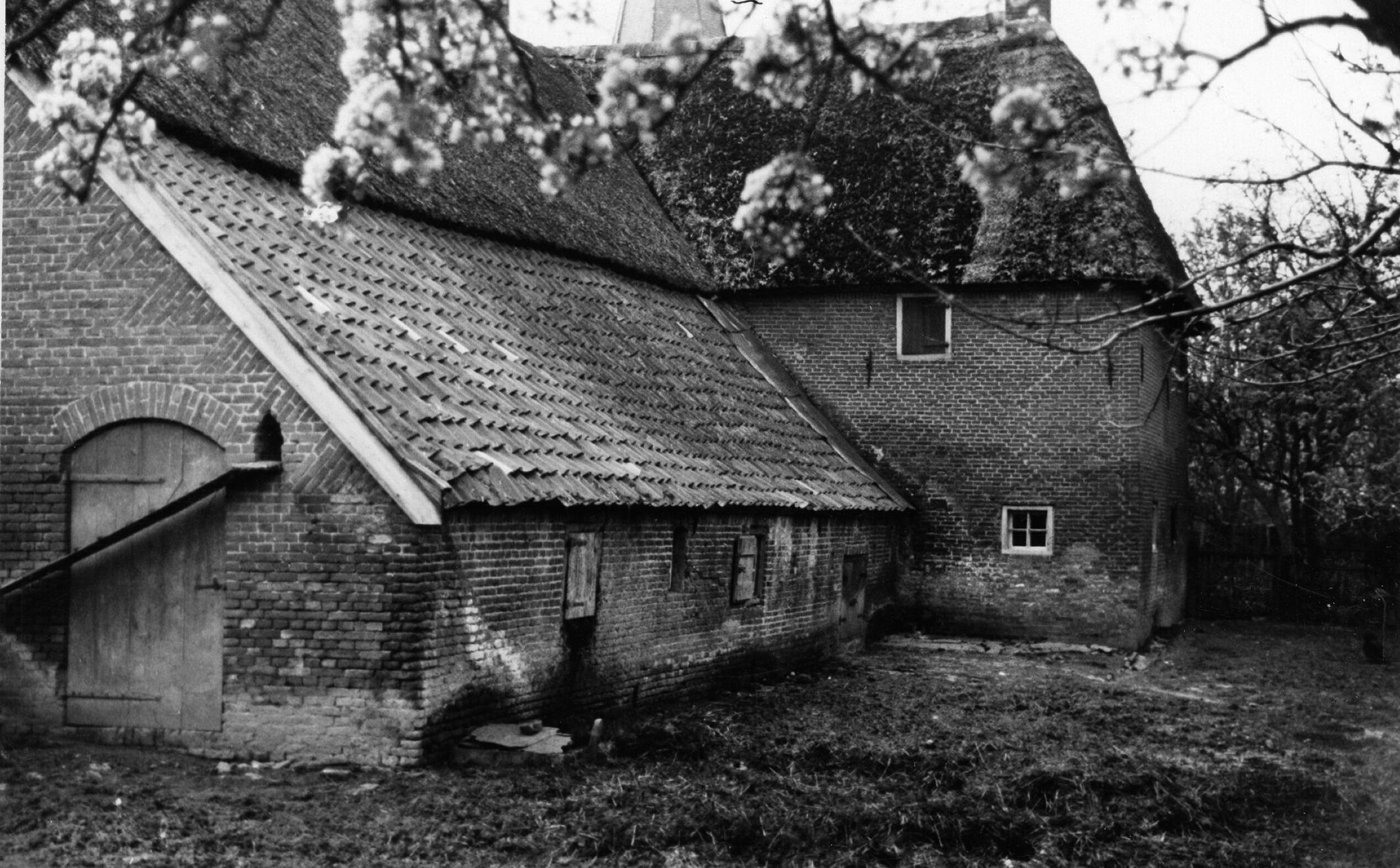 Achter- en zijgevel van een T-boerderij in het Gelderse Randwijk, met aan de achtergevel een kippentrap.