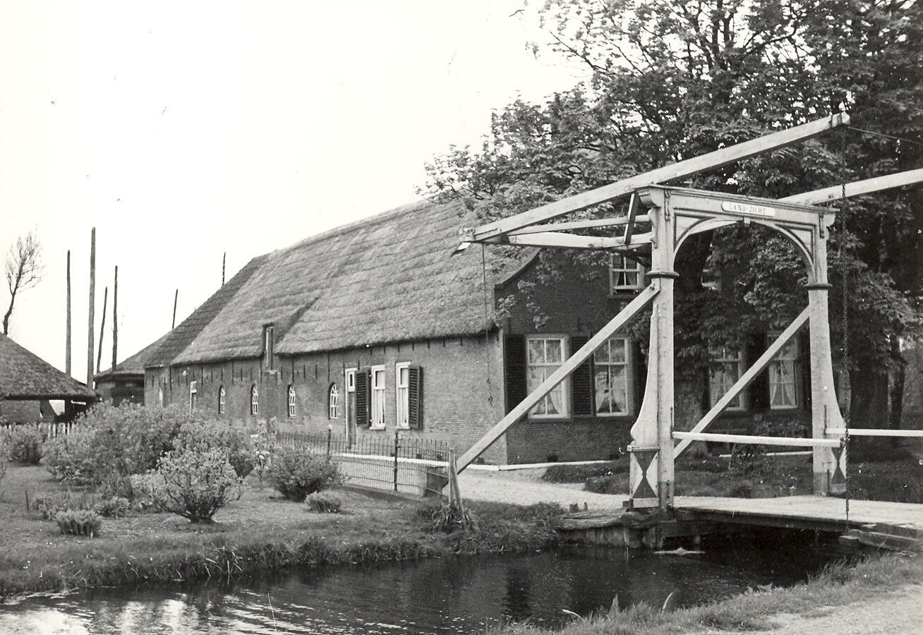 Boerderij Landzicht aan de Veenweg in Nootdorp. Voor de boerderij ligt een ophaalbrug over het water. Achter de boerderij ligt een hooiberg.