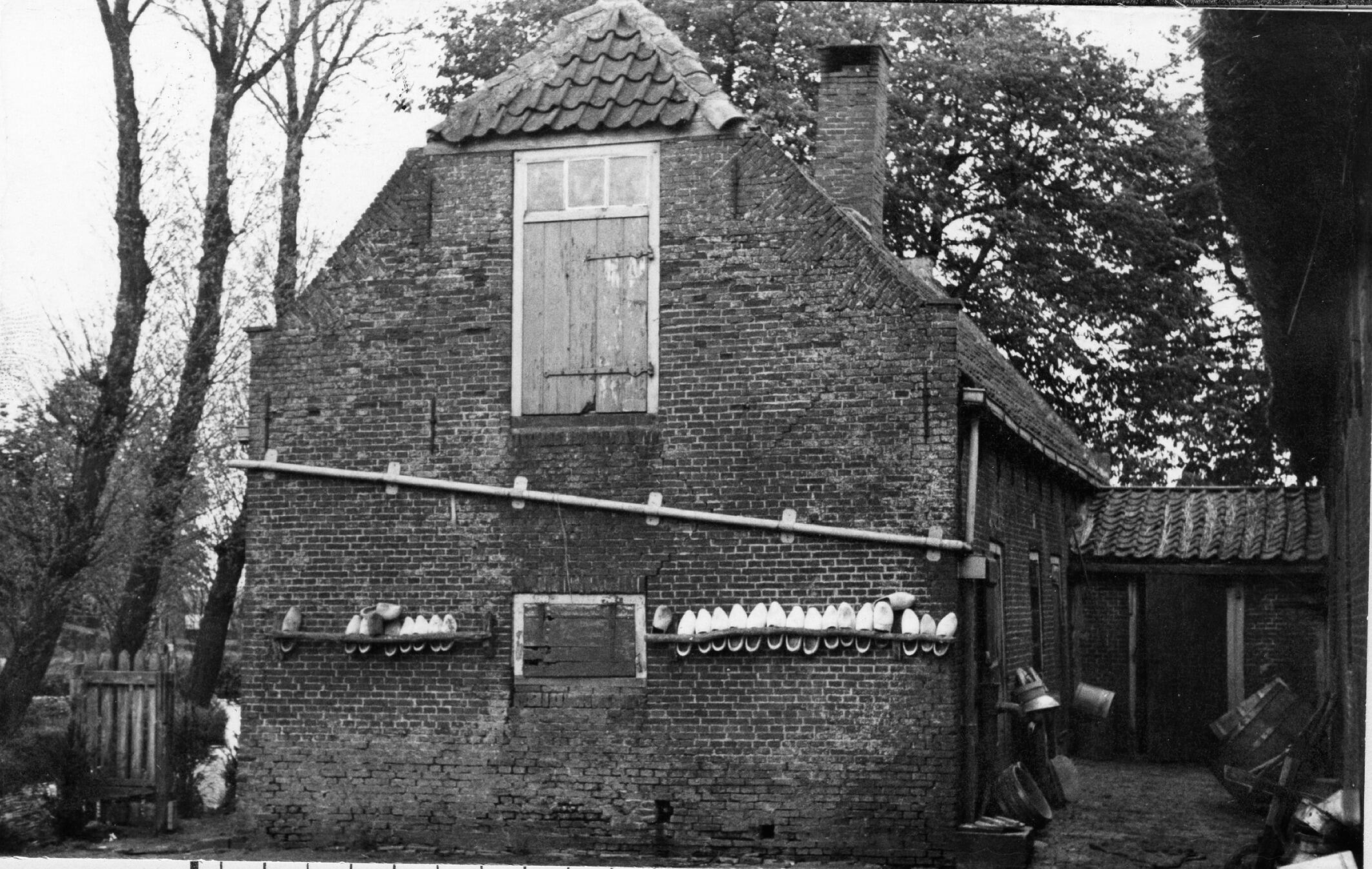 Achtergevel van het zomerhuis van boerderij Landzicht aan de Veenweg in Nootdorp. Aan de gevel hangen twee rekken met klompen.