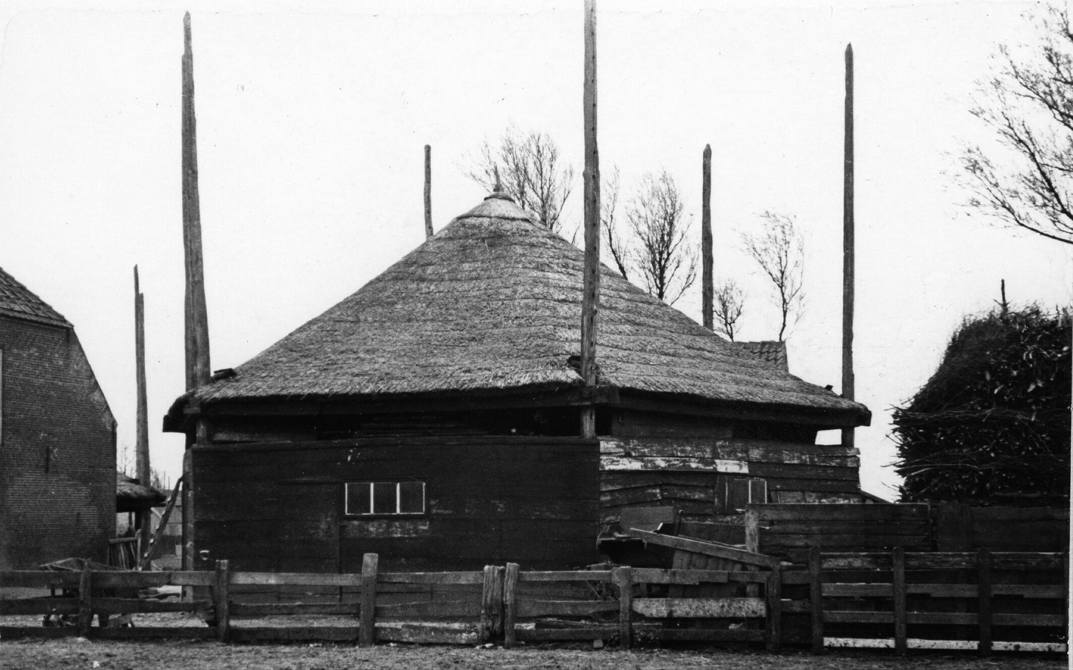 Schuurberg voor de opslag van hooi op het terrein van boerderij Landzicht aan de Veenweg in Nootdorp. De schuurberg heeft een in hoogte verstelbaar dak op zes roeden.