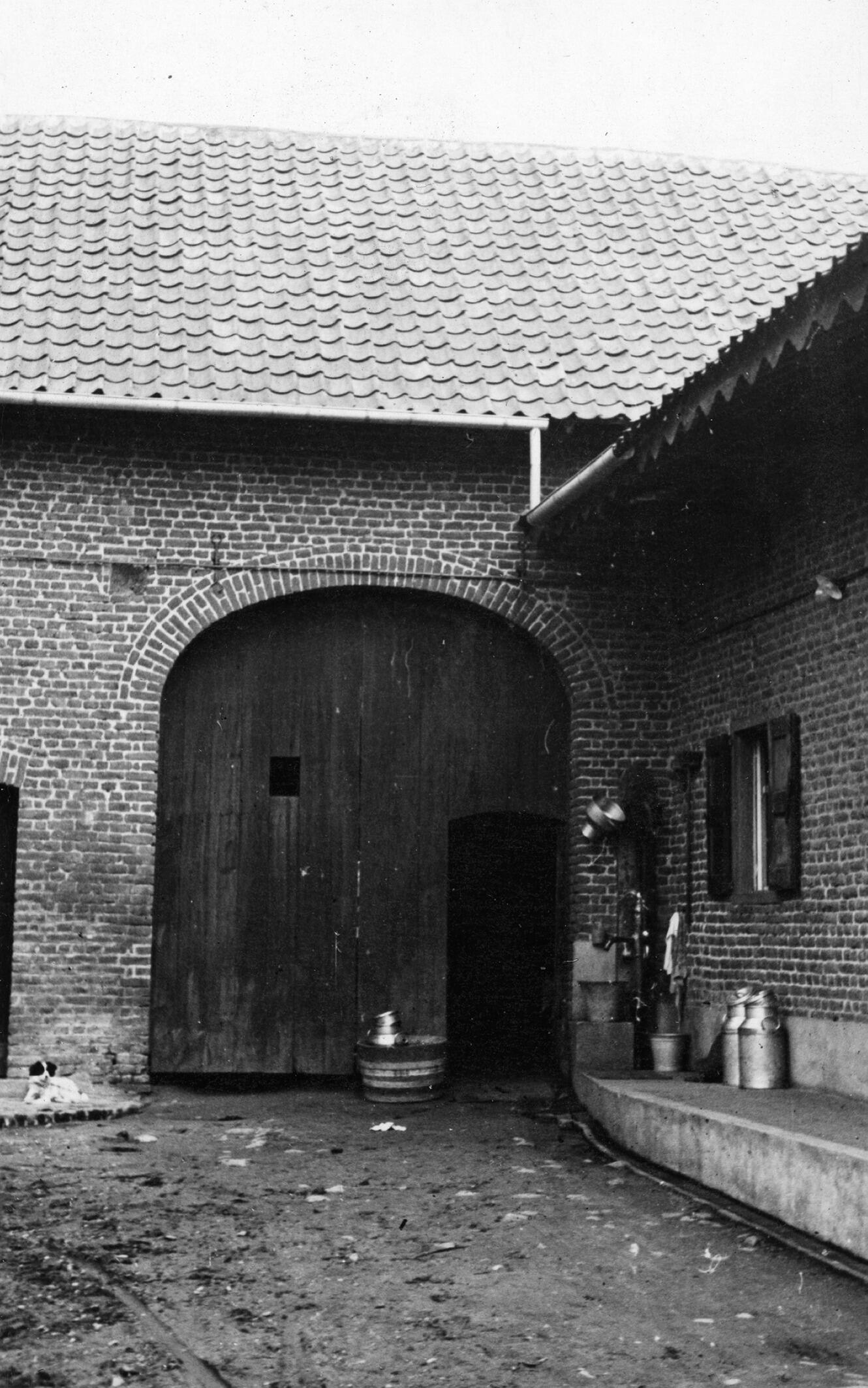 Binnenplaats met inrijdeur van een boerderij in het Limburgse Limbricht. Op de binnenplaats staan melkbussen en ligt een hond.