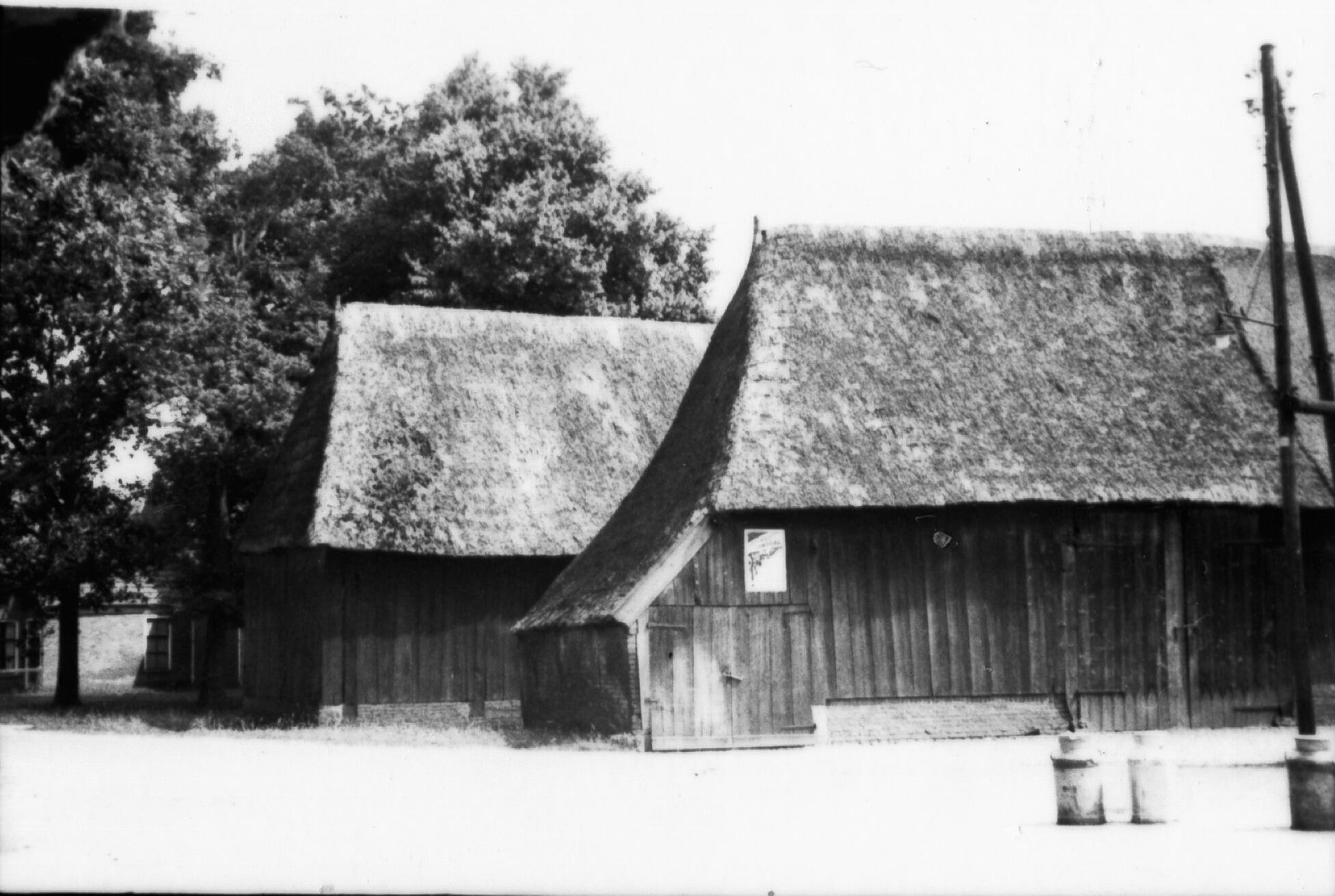 Twee bijschuren op een boerderij in het Drentse Eext. Op het erf staan melkbussen.