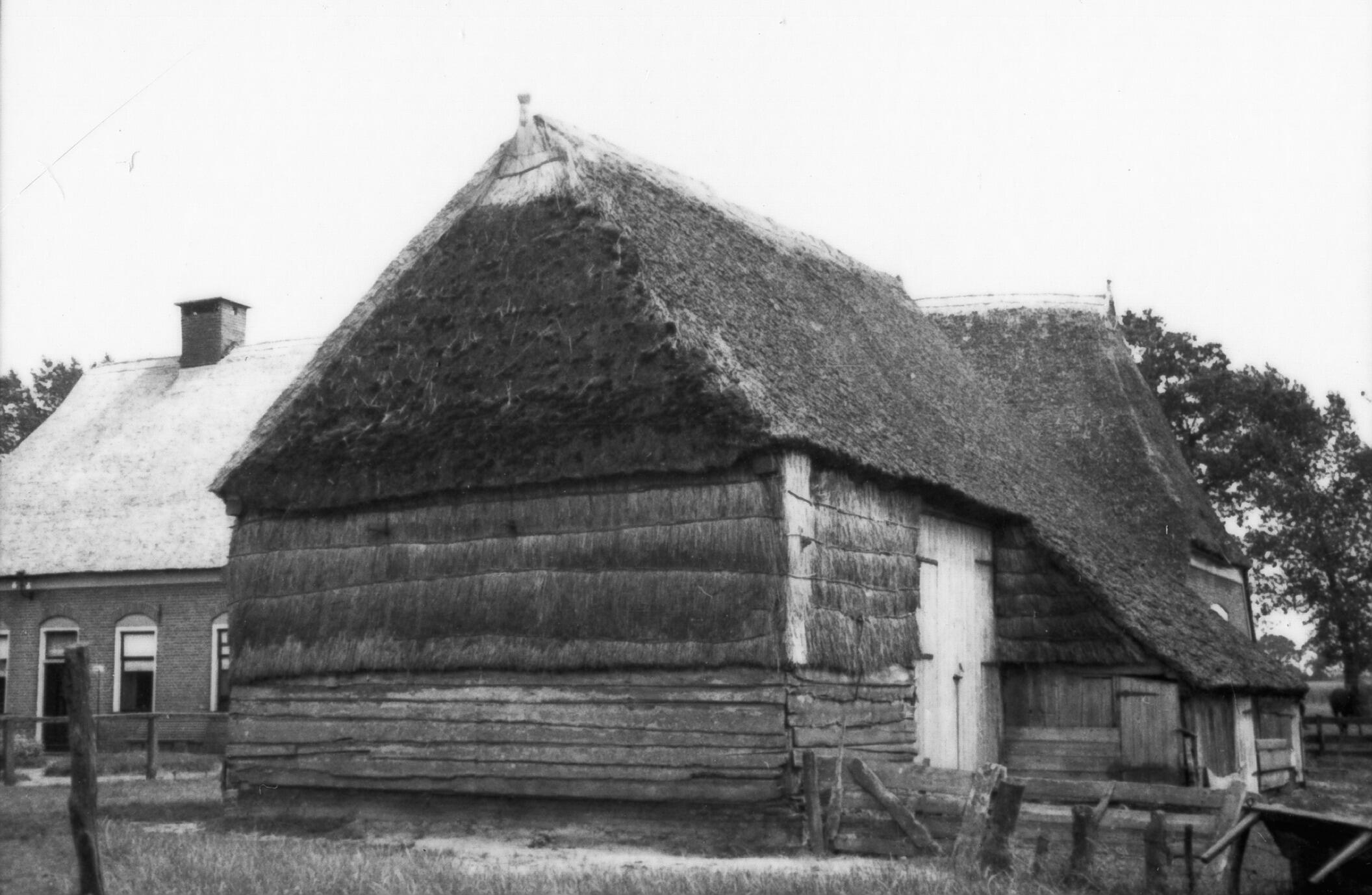 Bijschuur in het Drentse Grolloo, met wanden die deels van stro en deels van gepotdekselde houten planken zijn. Linksachter staat de boerderij.