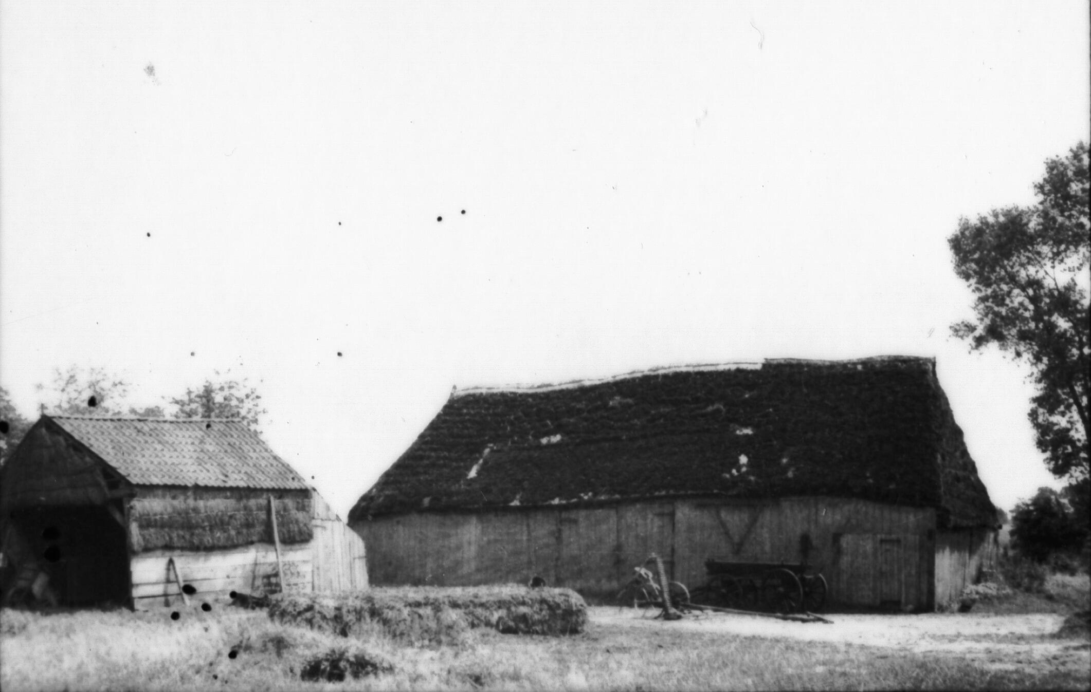 Twee schuren en mestvaalt, Grolloo, 1937 (zwart-wit foto)