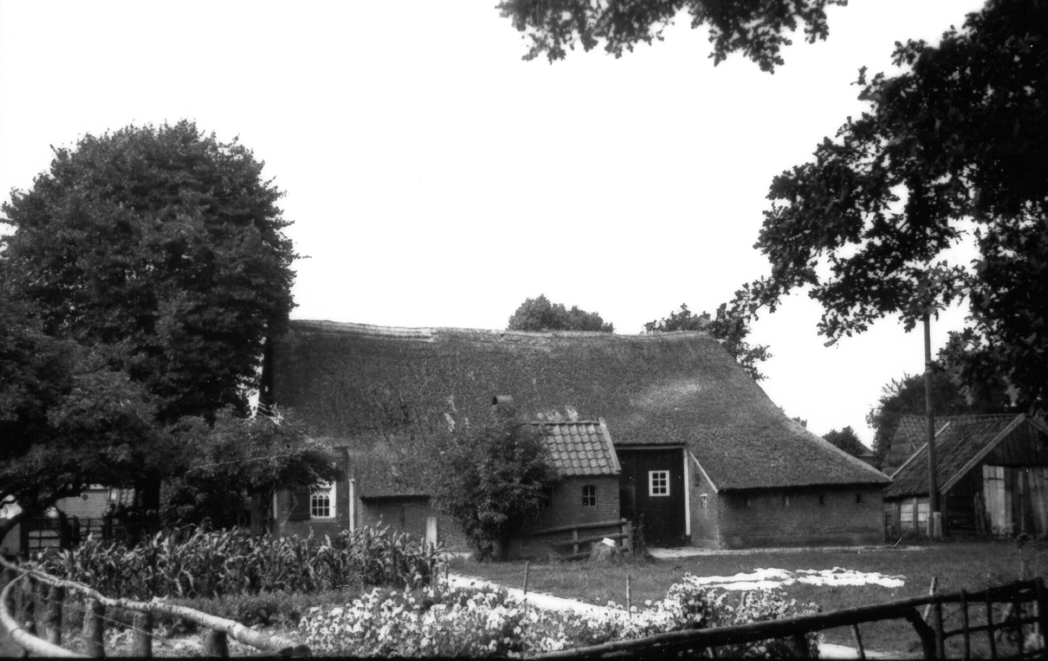 Boerderij in het Drentse Westervelde, met links het woongedeelte en rechts het bedrijfsgedeelte. Naast de boerderij ligt een moestuin.