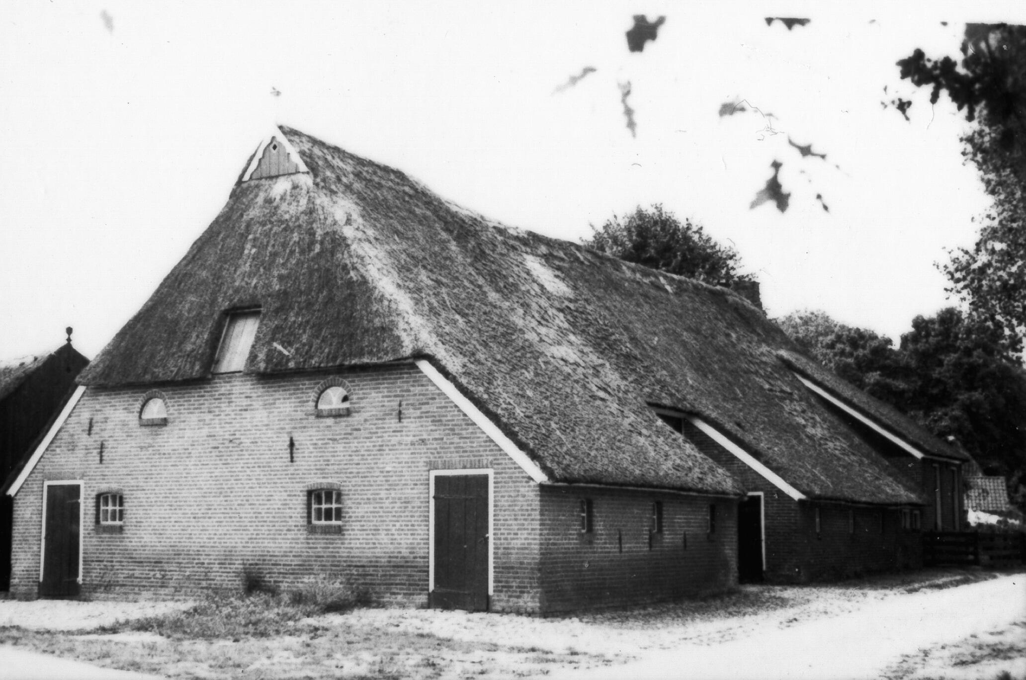 Achter- en zijgevel van een hallenhuisboerderij in het Drentse Rolde, met links het bedrijfsgedeelte en rechts het woongedeelte.