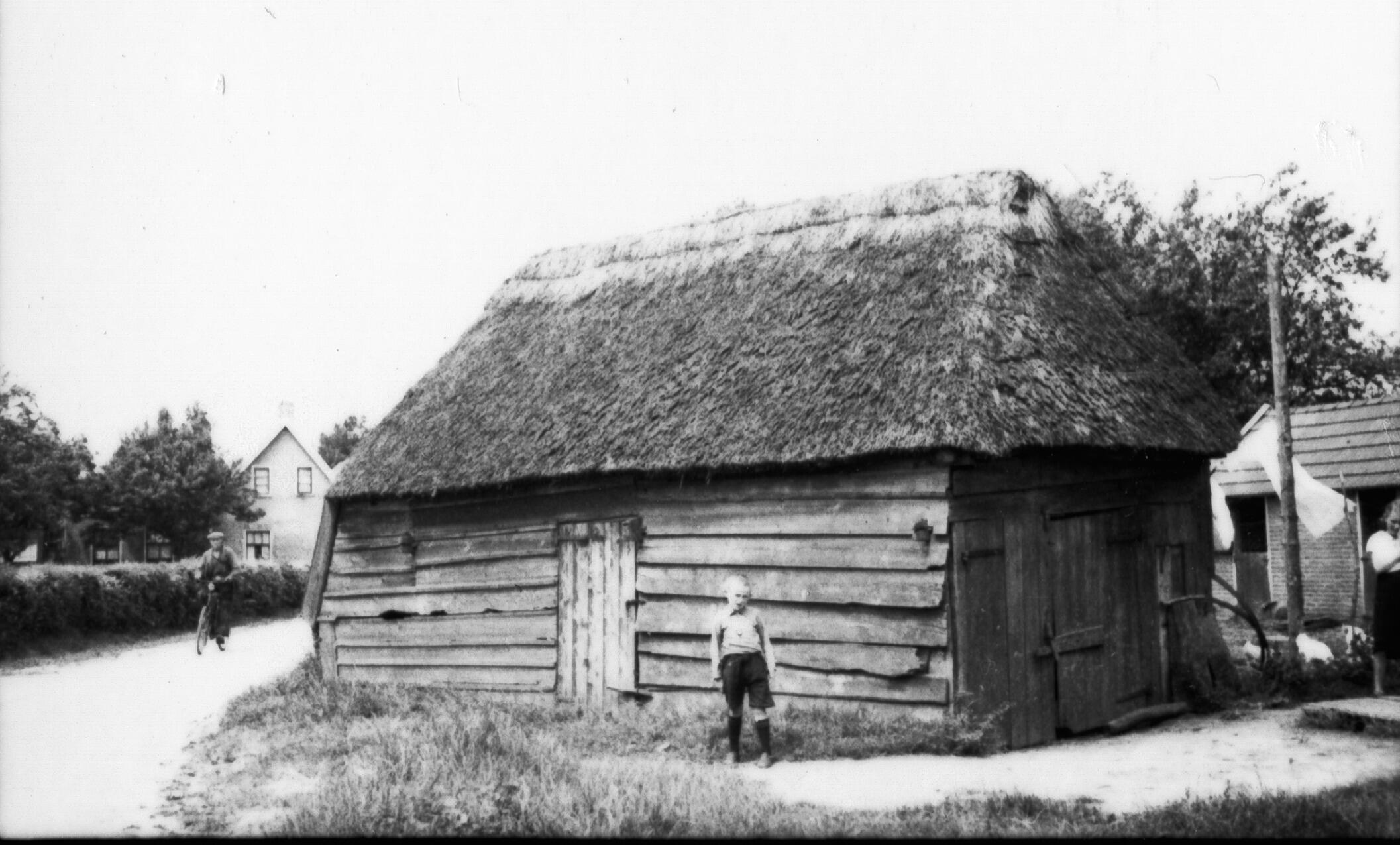 Bijschuur in het Drentse Rolde. Voor de schuur staat een jongen. Links op de weg fietst een man.