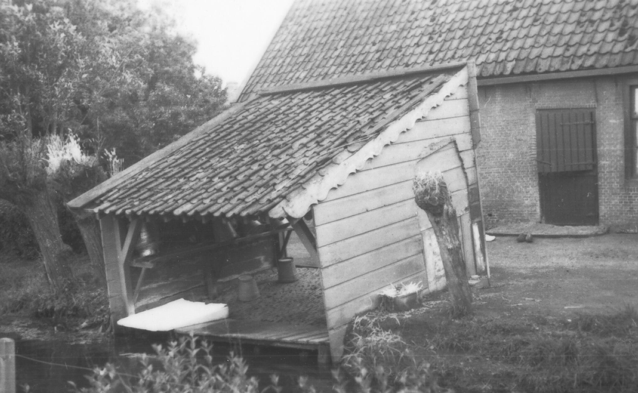 Boenhok of spoelplaats, gelegen aan het water bij een boerderij in het Zuid-Hollandse Nieuwerkerk aan den IJssel.