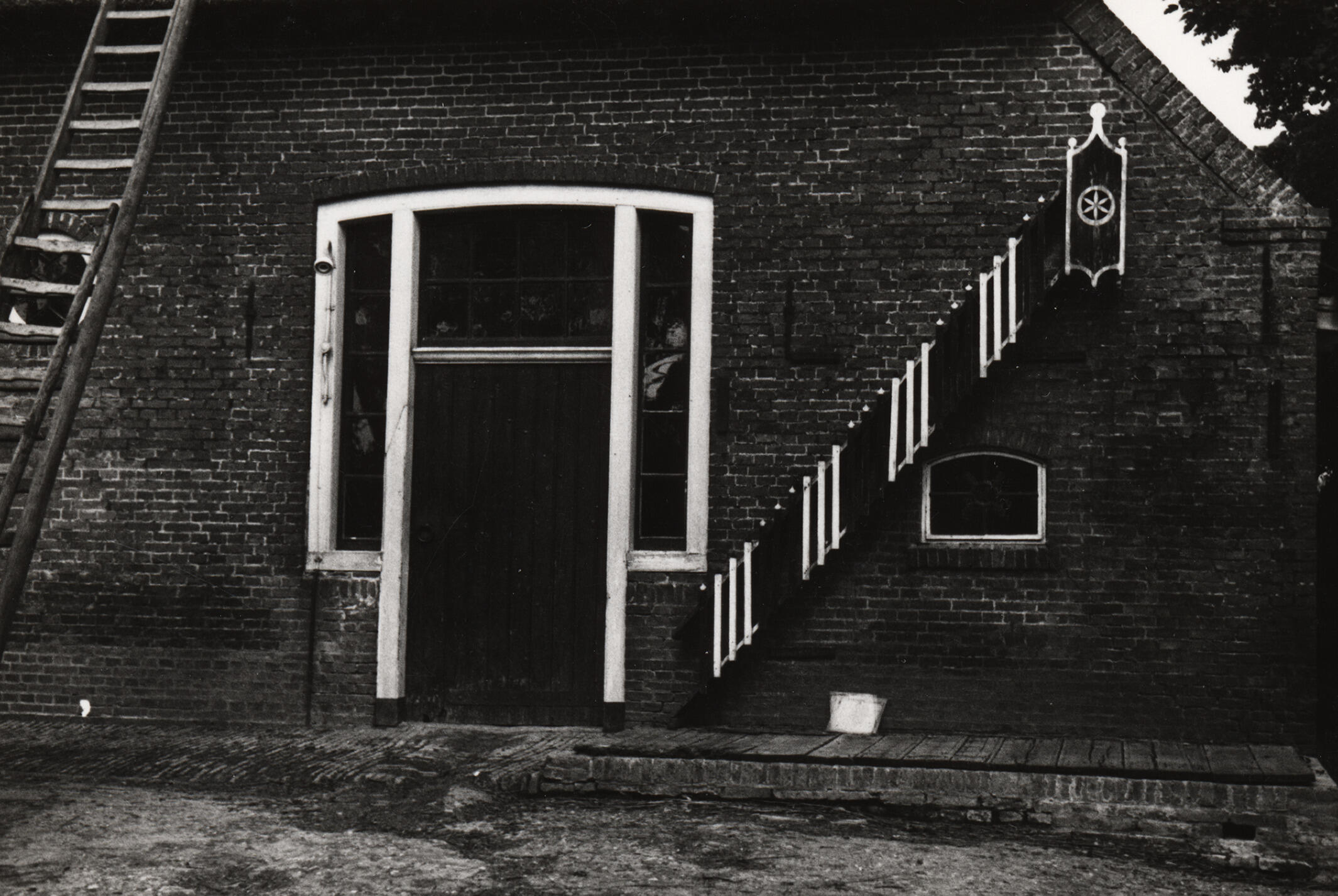 Achtergevel van een boerderij in het Friese Tzummarum, met links van de deur een ladder en rechts een kippentrap.