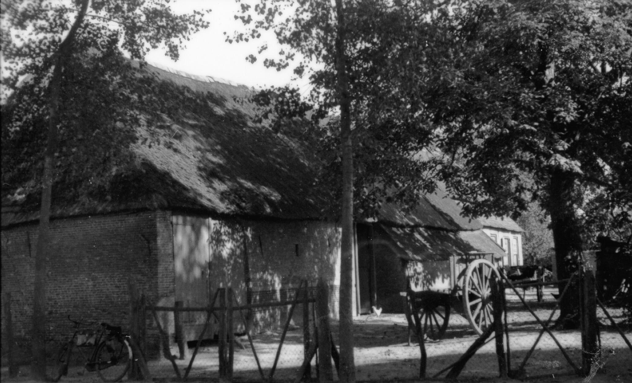 Boerderij in het Brabantse Den Dungen. Op het erf staan een fiets en boerenkarren.