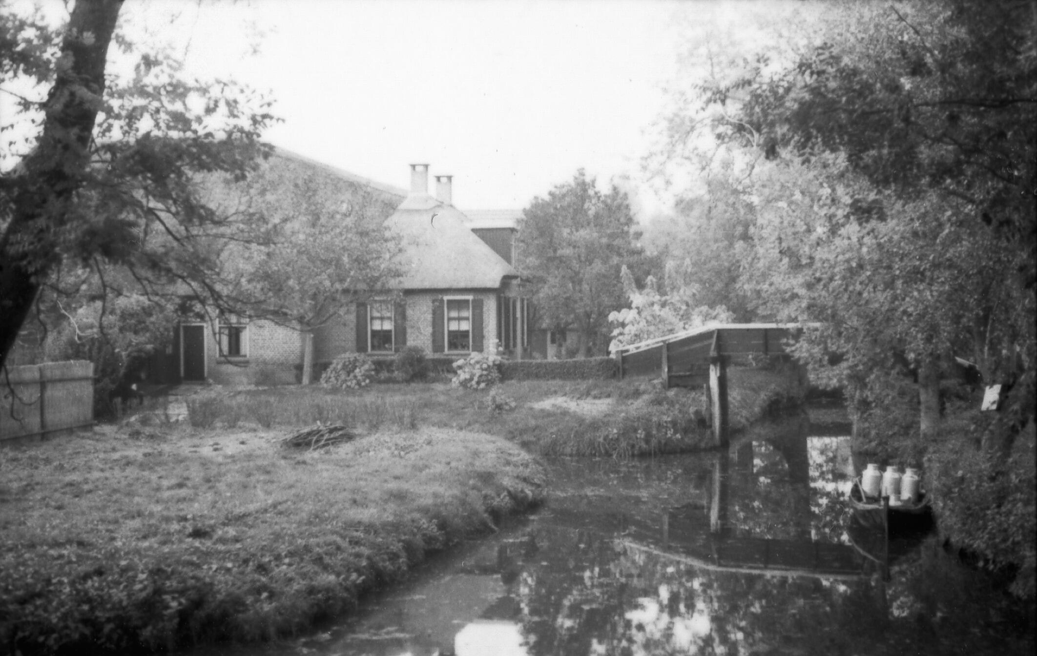 Boerderij in Zuideinde, ten zuiden van Giethoorn, met rechts een brug over het water en een punter met melkbussen.