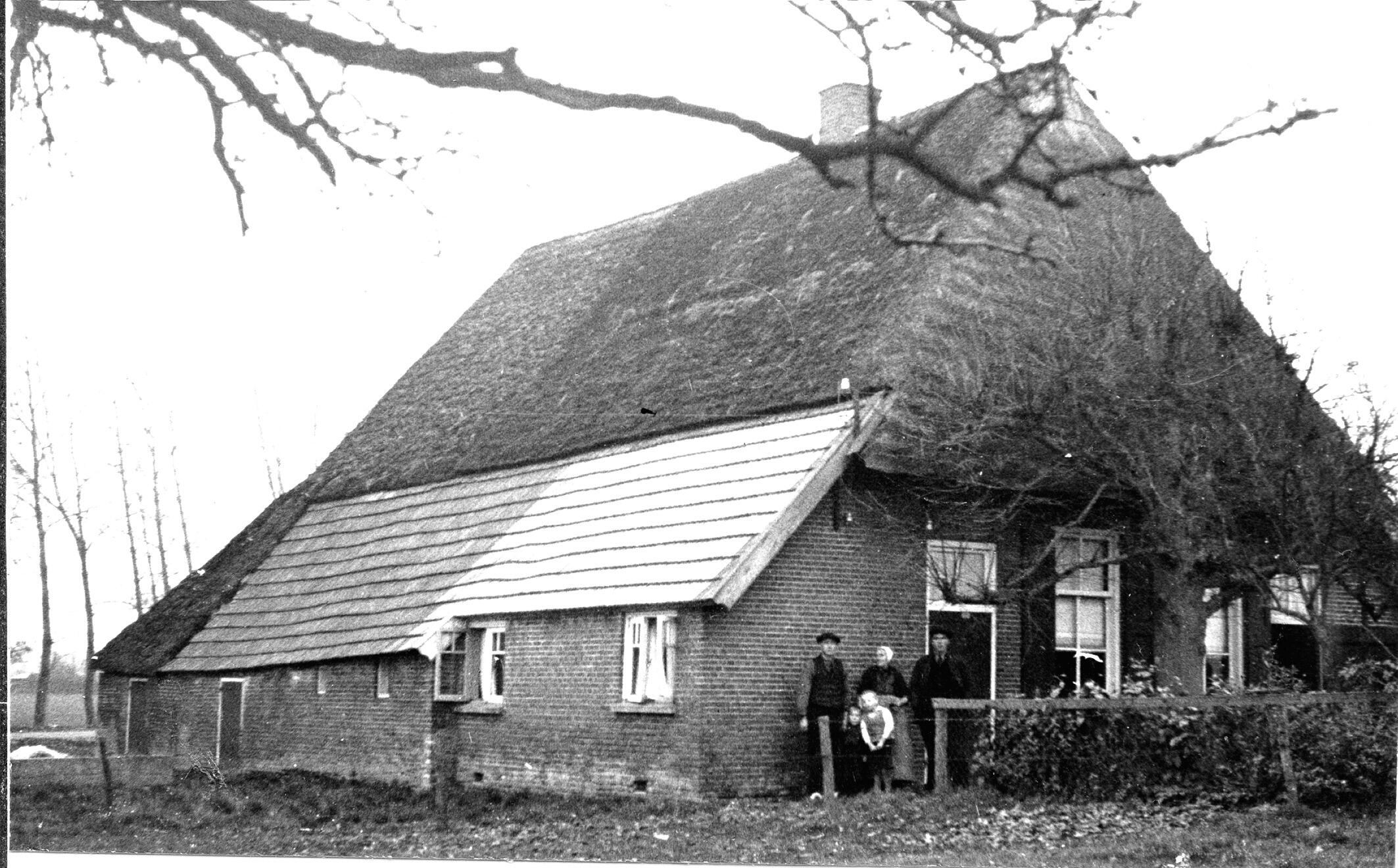 Boerderij in het Overijsselse Wierden. Voor de boerderij staan twee mannen, twee kinderen en een vrouw.