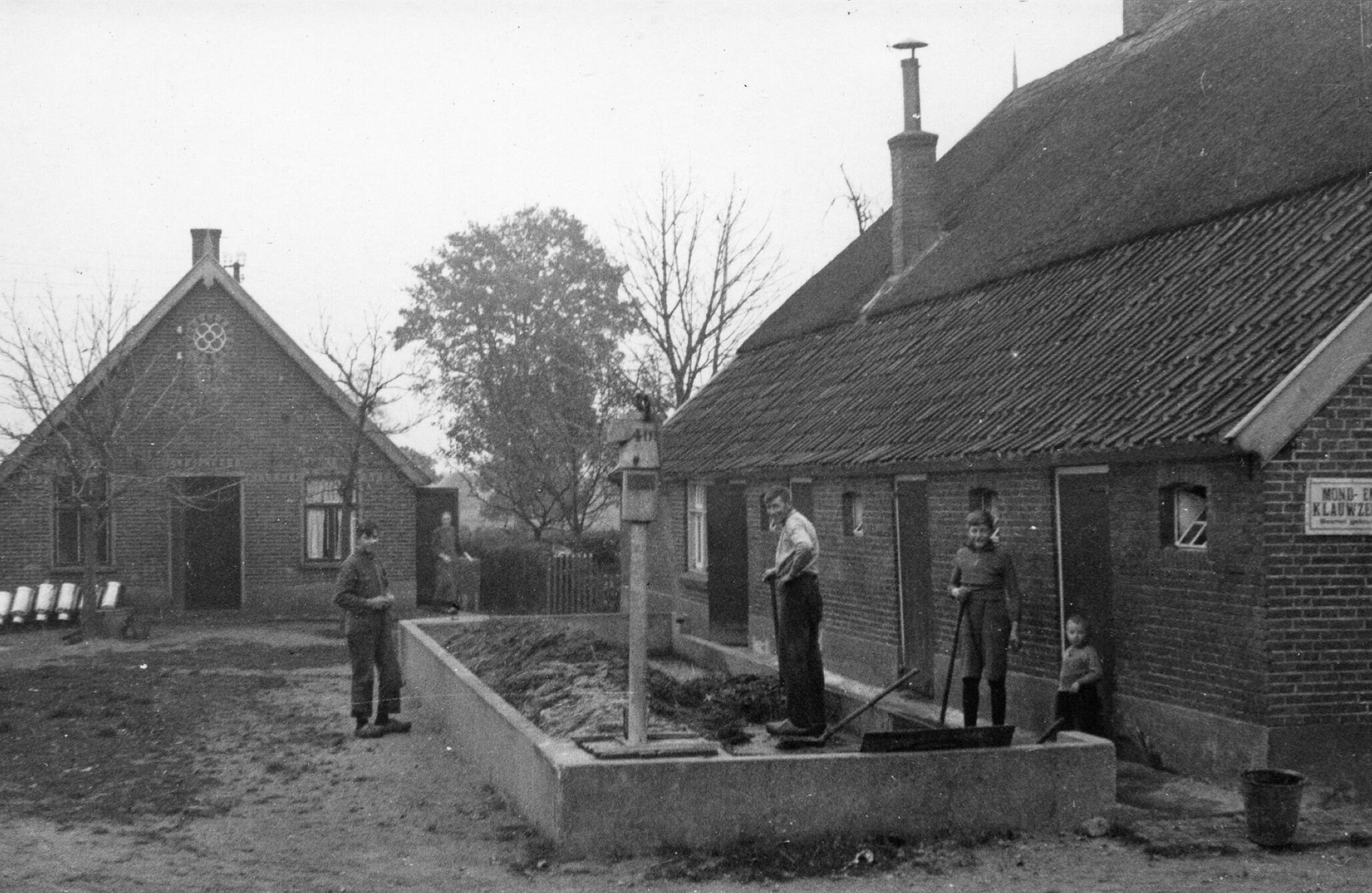 Een man en kinderen bij een mestvaalt met gierpomp op een boerenerf in het Overijsselse Het Loo, bij Wierden. Op een bordje aan de gevel rechts staat 'Mond- en klauwzeer'. Links staat het woonhuis met tegen de gevel een melkbussenrek.