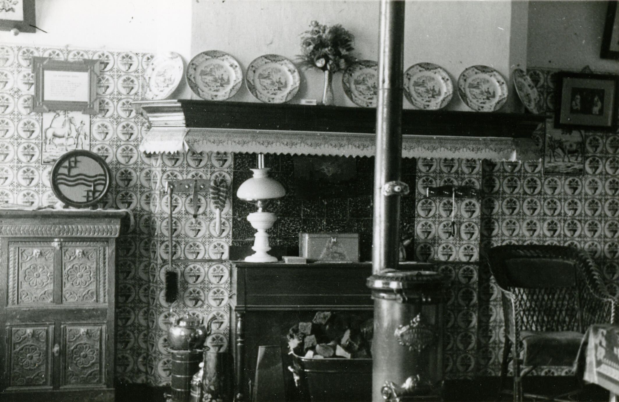 Keukeninterieur van een boerderij in het Gelderse Laren, met een kachel en een schouw. De muur is bedekt met wandtegels. Boven de schouw staan wandborden. Op de kast links staat een luidspreker van het merk Philips.