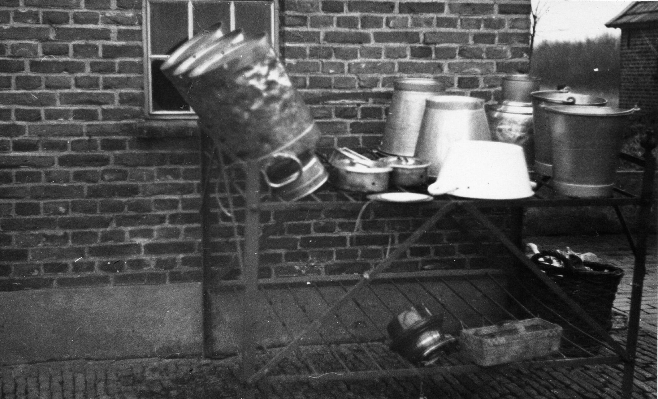Melkbussenrek met melkbussen, emmers en vaatwerk bij een boerderij in het Gelderse Harfsen.