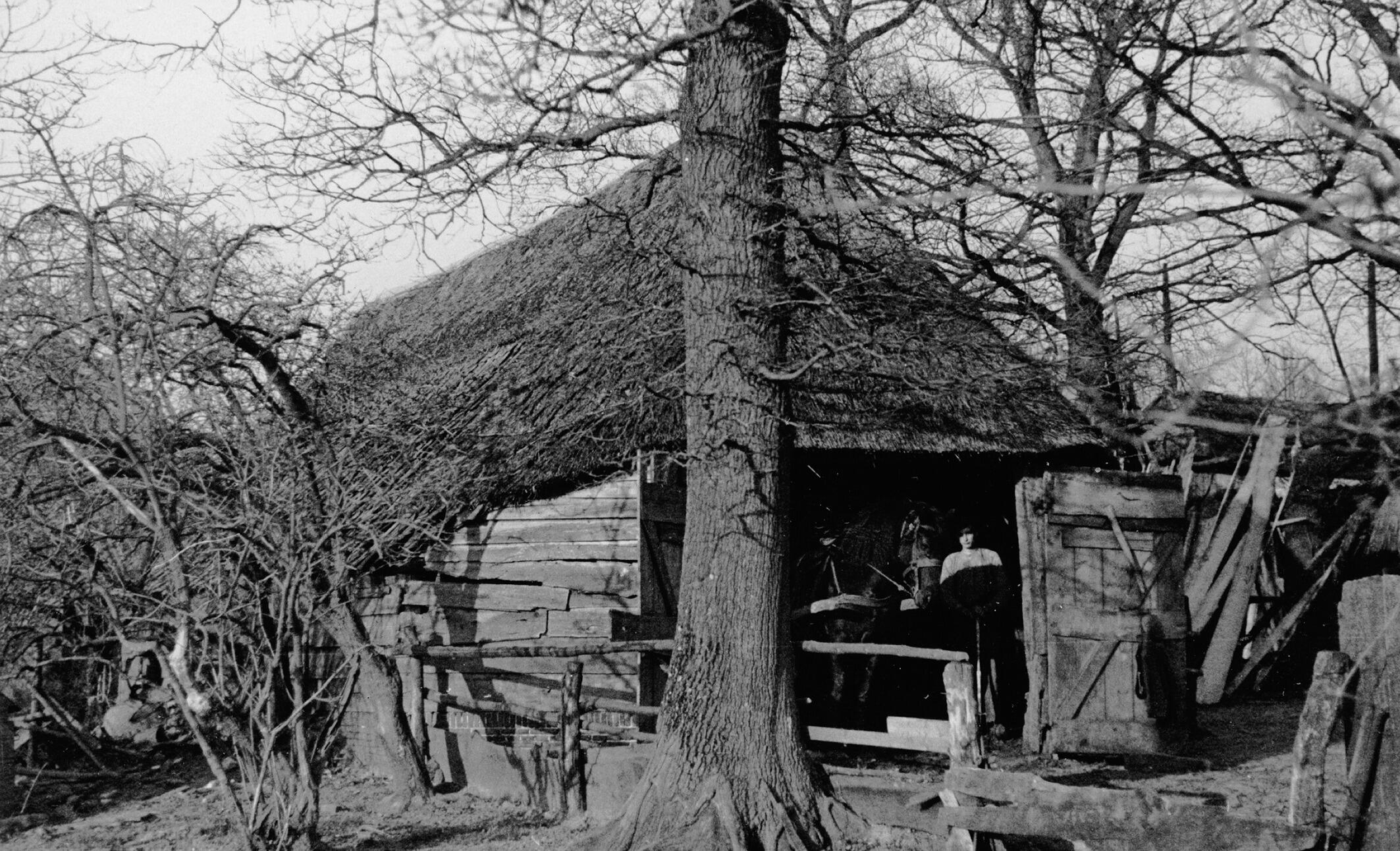Een schaapskooi in het Gelderse Manen, bij Ede. In de deuropening staan een man en een ingespannen paard.