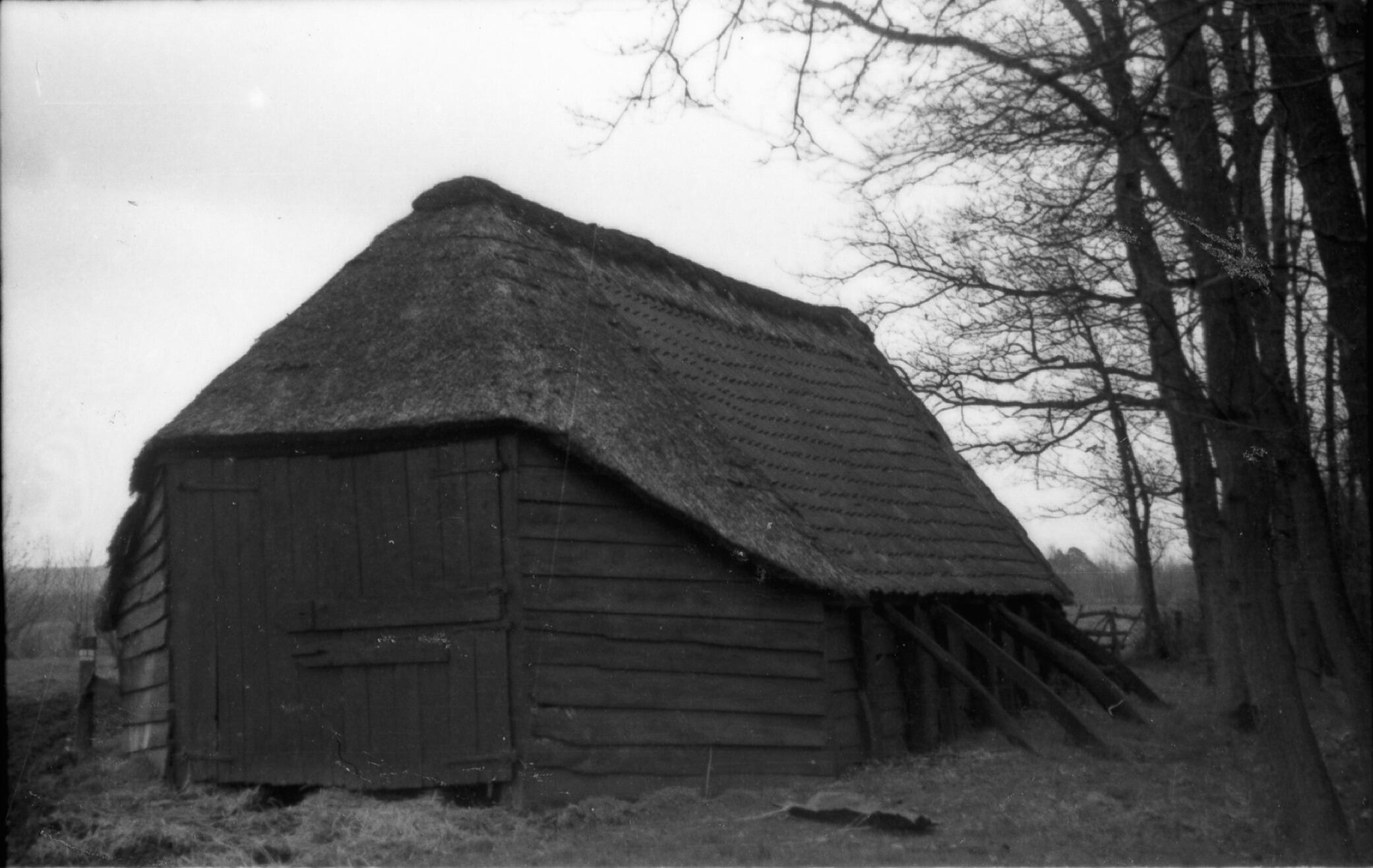 Een schaapskooi in het Gelderse Barneveld. De zijgevel wordt gestut met houten balken.