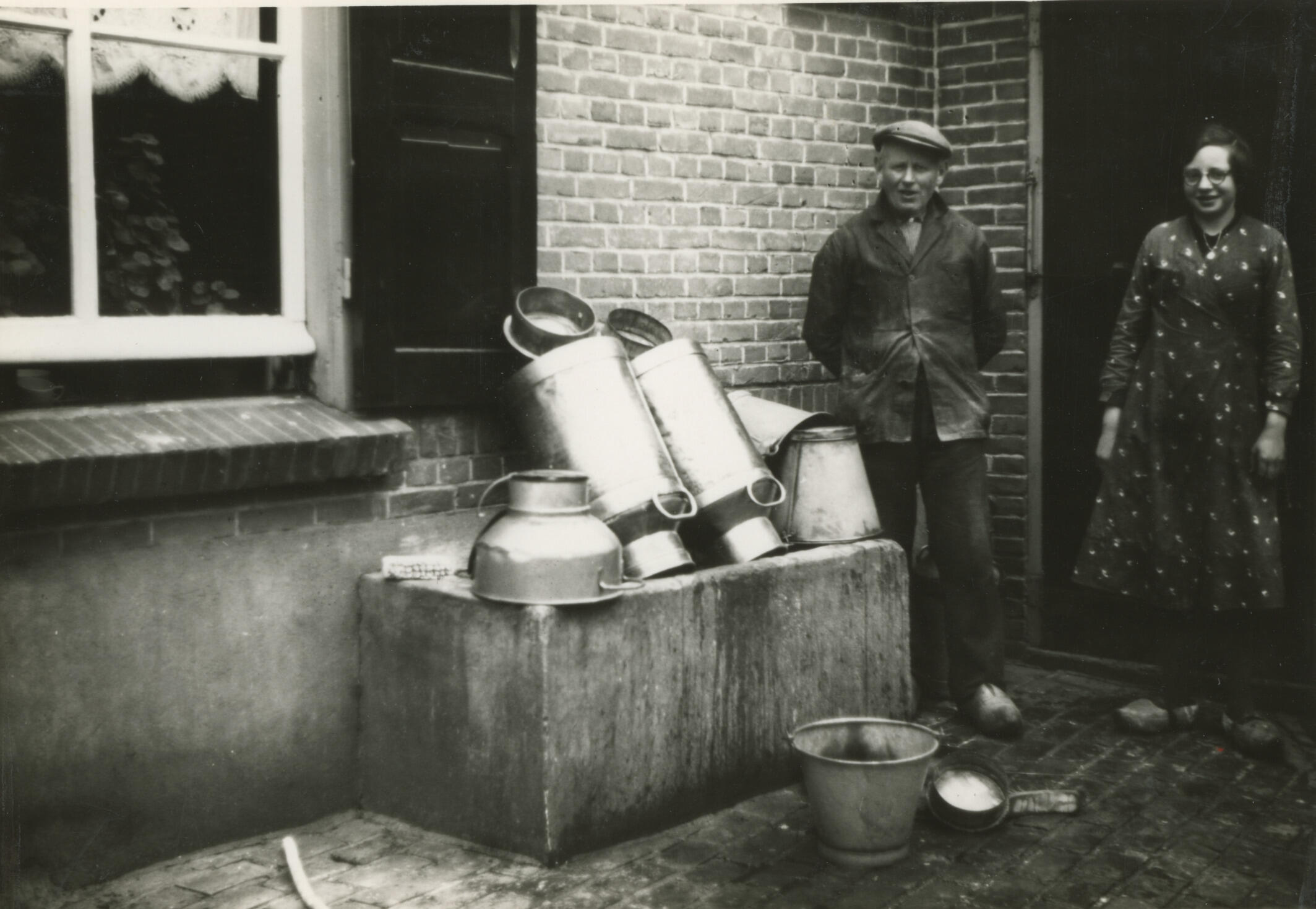 Een koelbak waarin melkbussen en emmers worden gewassen bij een boerderij in het Brabantse Veghel. Naast de koelbak staan een man en een vrouw.