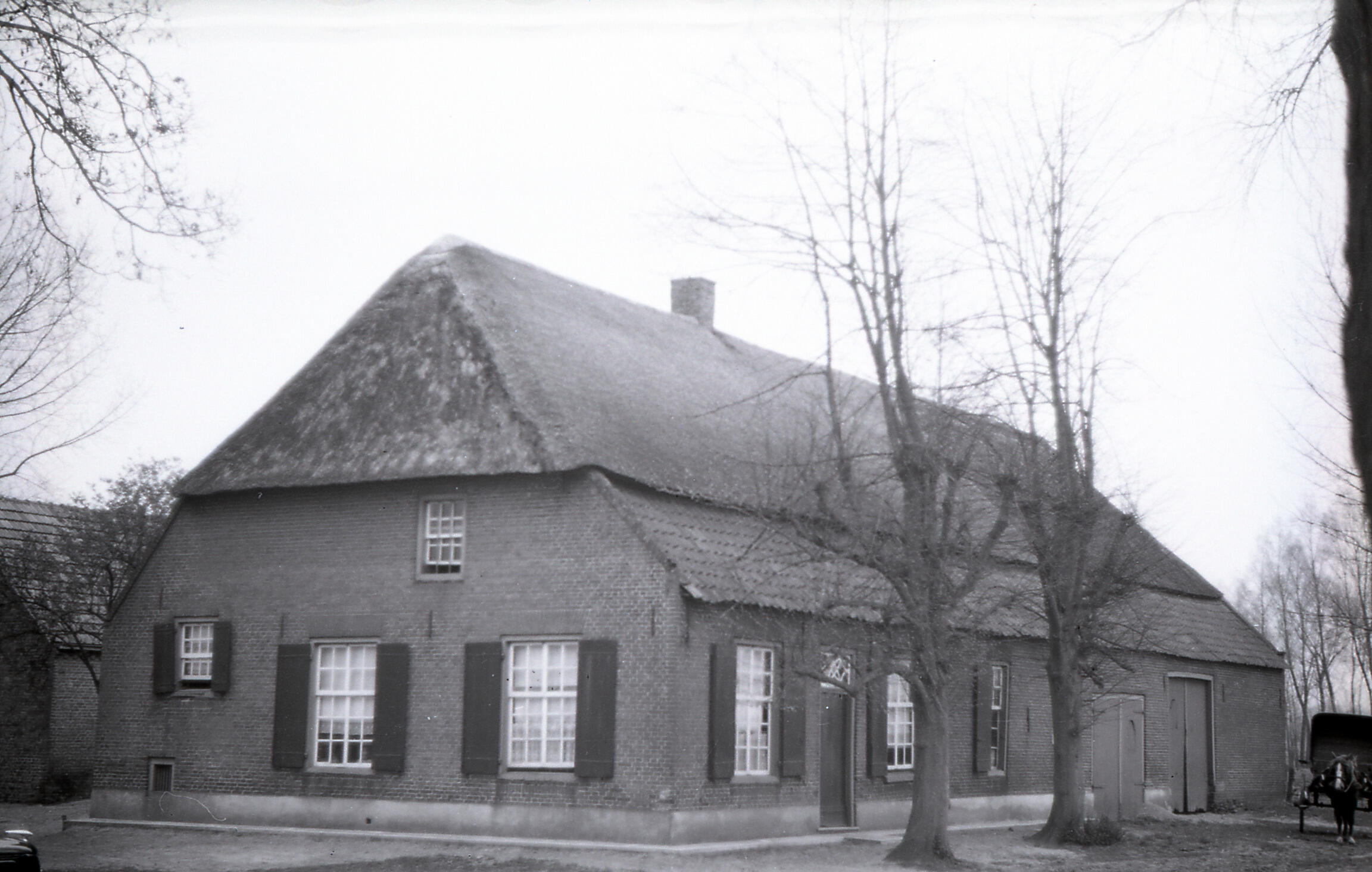 Langgevelboerderij in het Brabantse Veghel, met links het woongedeelte en rechts het bedrijfsgedeelte. Naast de boerderij staat een paard met daarachter een wagen.