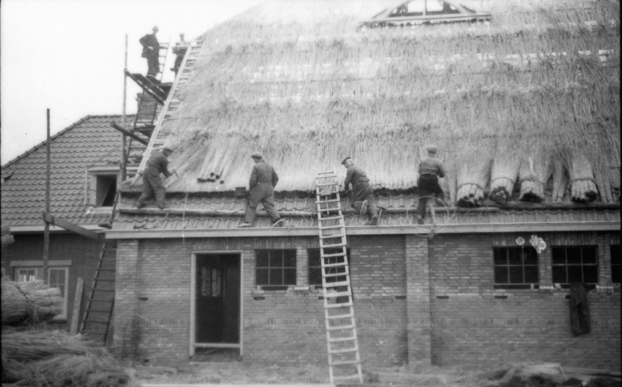 Rietdekken van een boerderij, Rhederveld, 1938 (zwart-wit negatief)