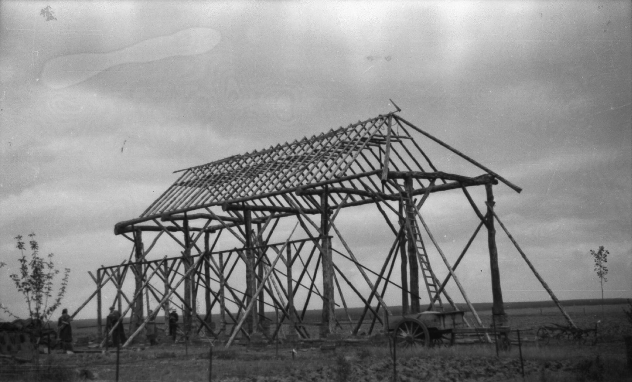 Schuur in aanbouw, Bourtange, 1938 (zwart-wit foto)