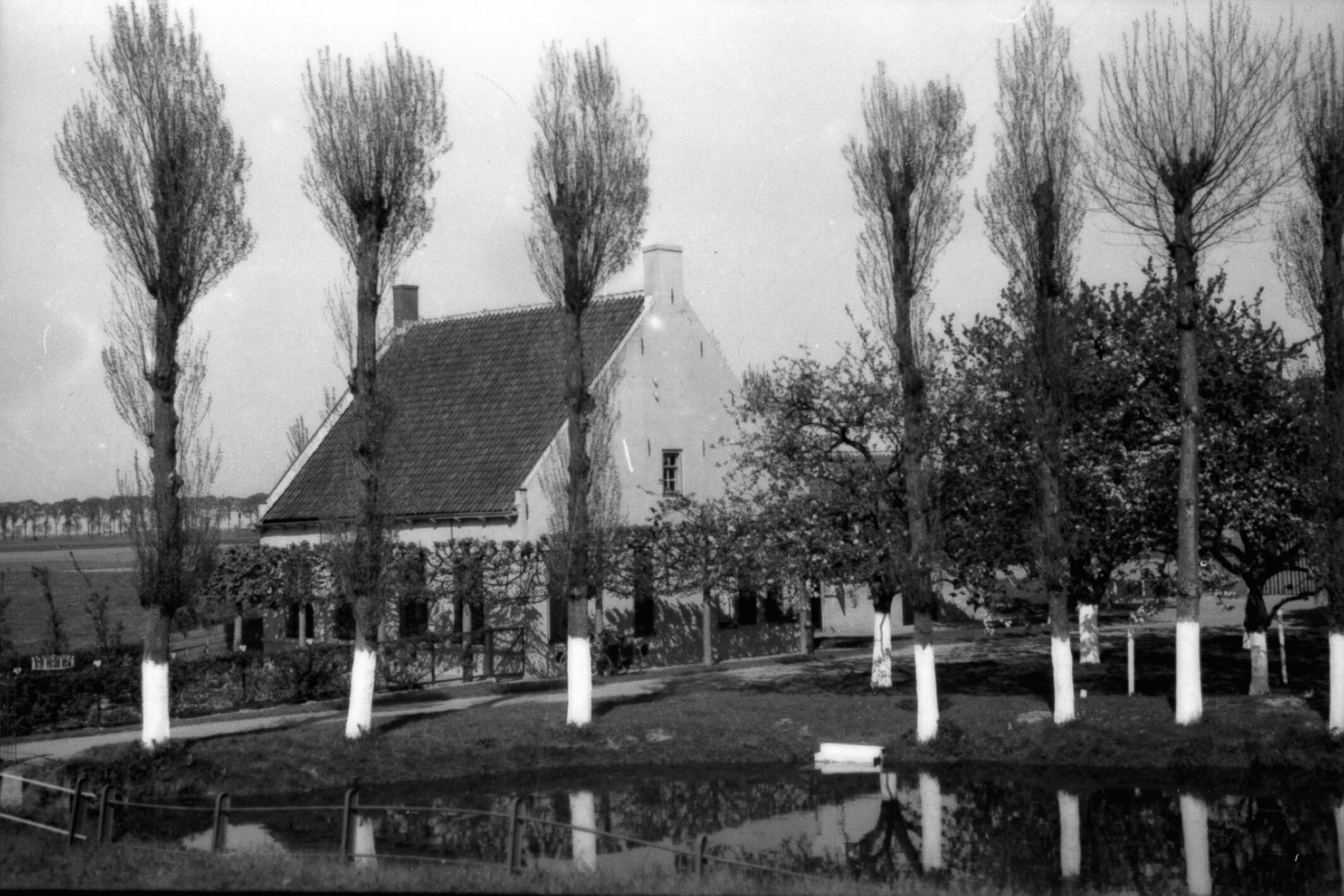 Boerderij in het Brabantse Zevenbergen. De bomen hebben witgeschilderde stammen.