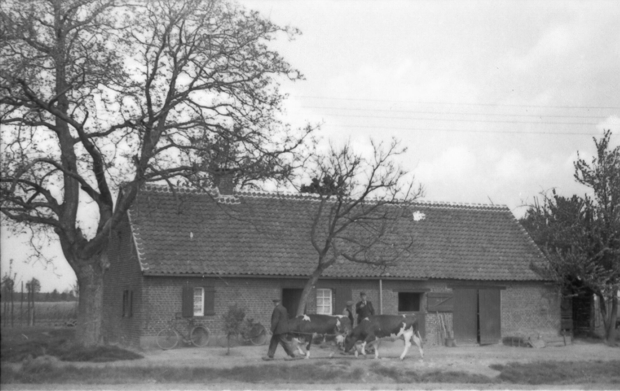 Een langgevelboerderij in het Brabantse Asten. Voor de boerderij staan drie mannen en twee koeien.