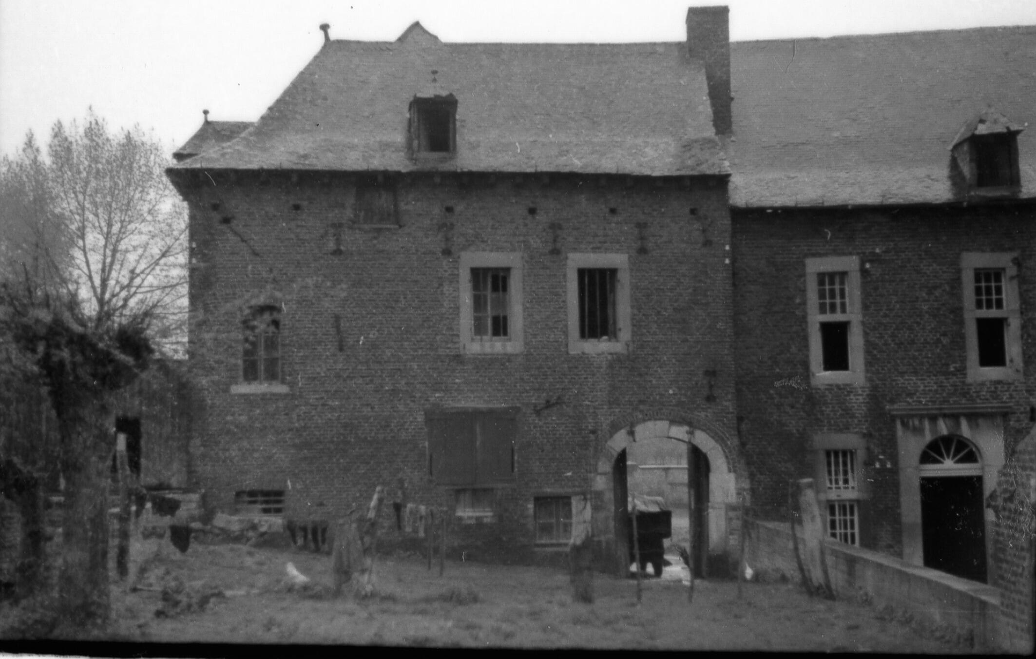 Achtergevel van vierkantshoeve 'Meschermolen' in het Limburgse Mesch. In de gevel zit een poort naar de binnenplaats.