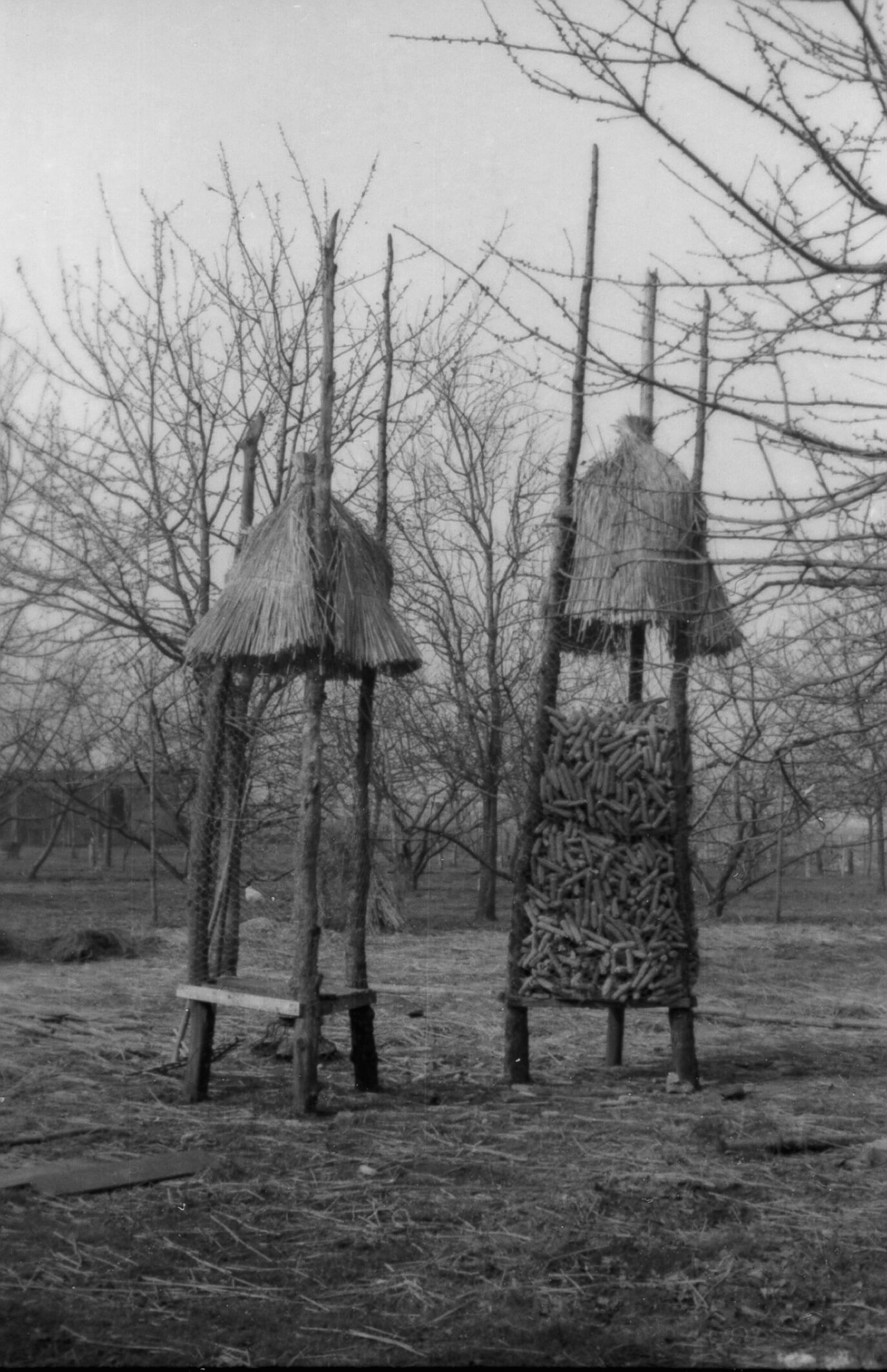 Twee constructies van houten takken, gaas en rieten kappen voor het opslaan en drogen van mais in het Brabantse Deurne.