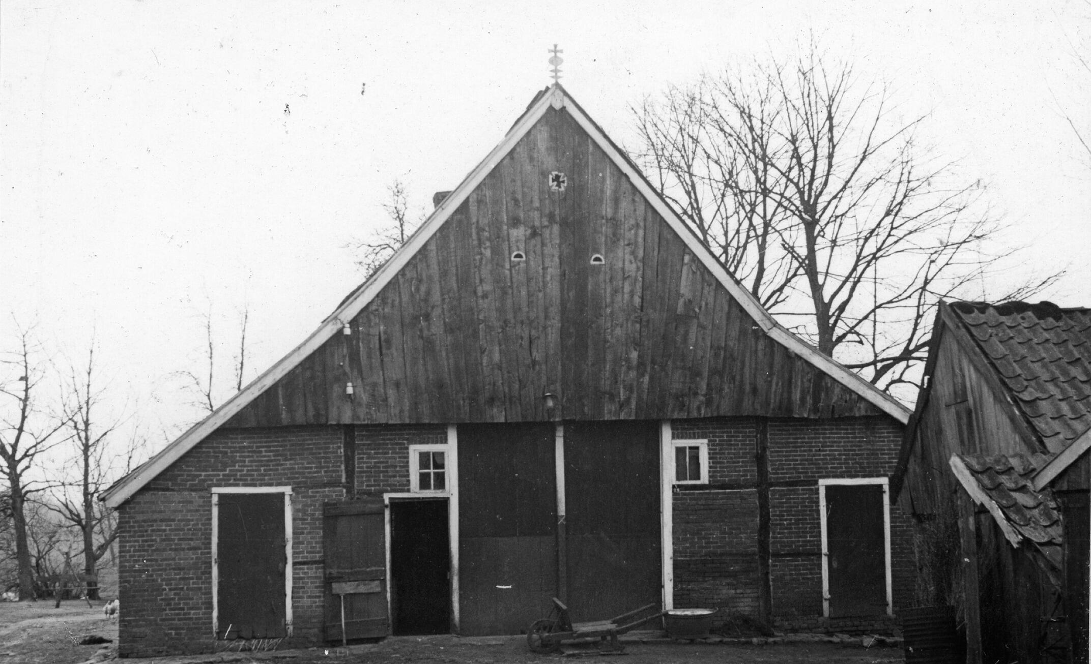Achtergevel van een boerderij met vakwerkbouw met baksteenvulling, een houten topgevel en op het dak een gevelteken. Op de houten topgevel zijn symbolen aangebracht, waaronder een Maltezer kruis.
