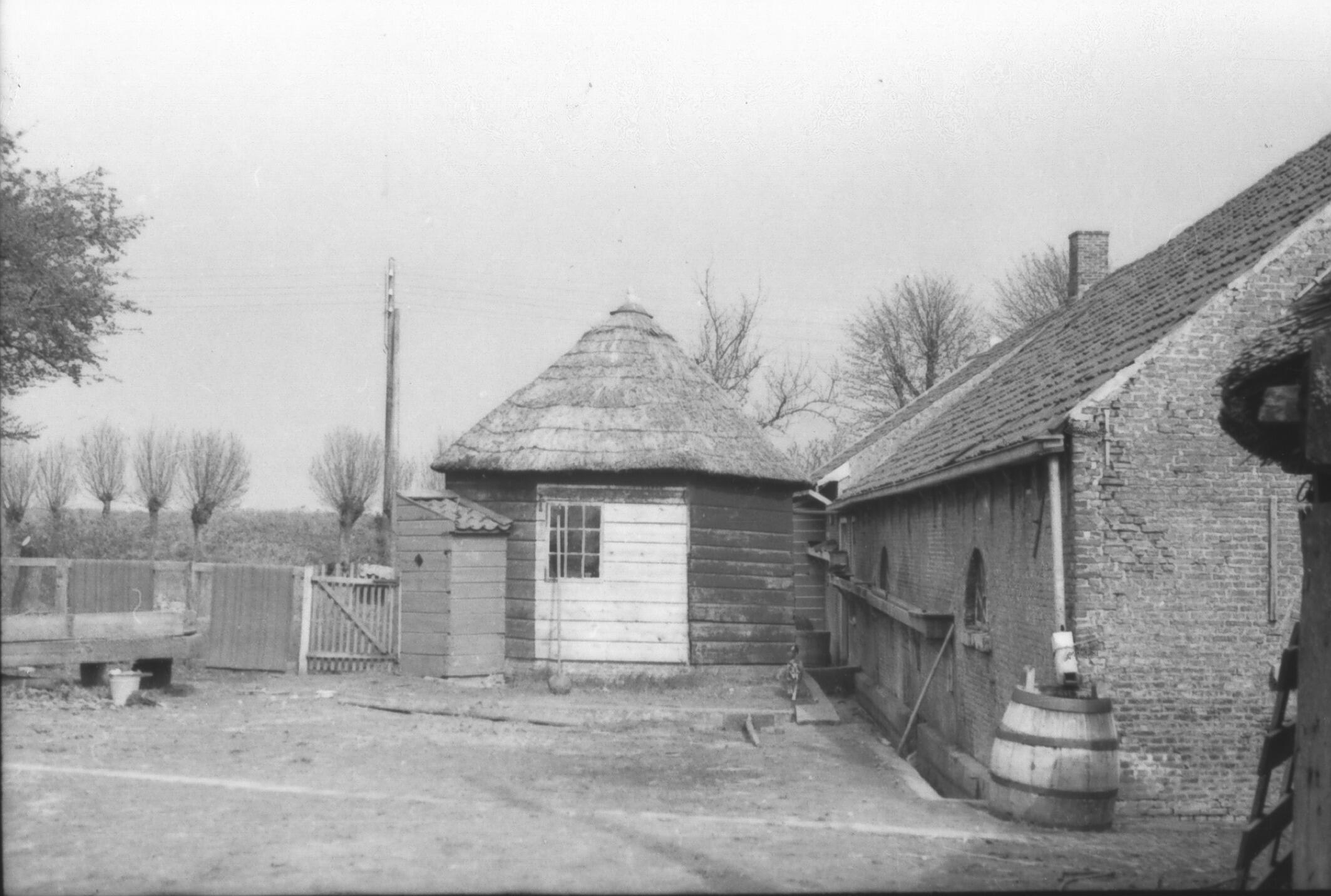 Erf van een boerderij met een privaat, karnmolen en schuur met regenton in het Zuid-Hollandse Schiebroek.