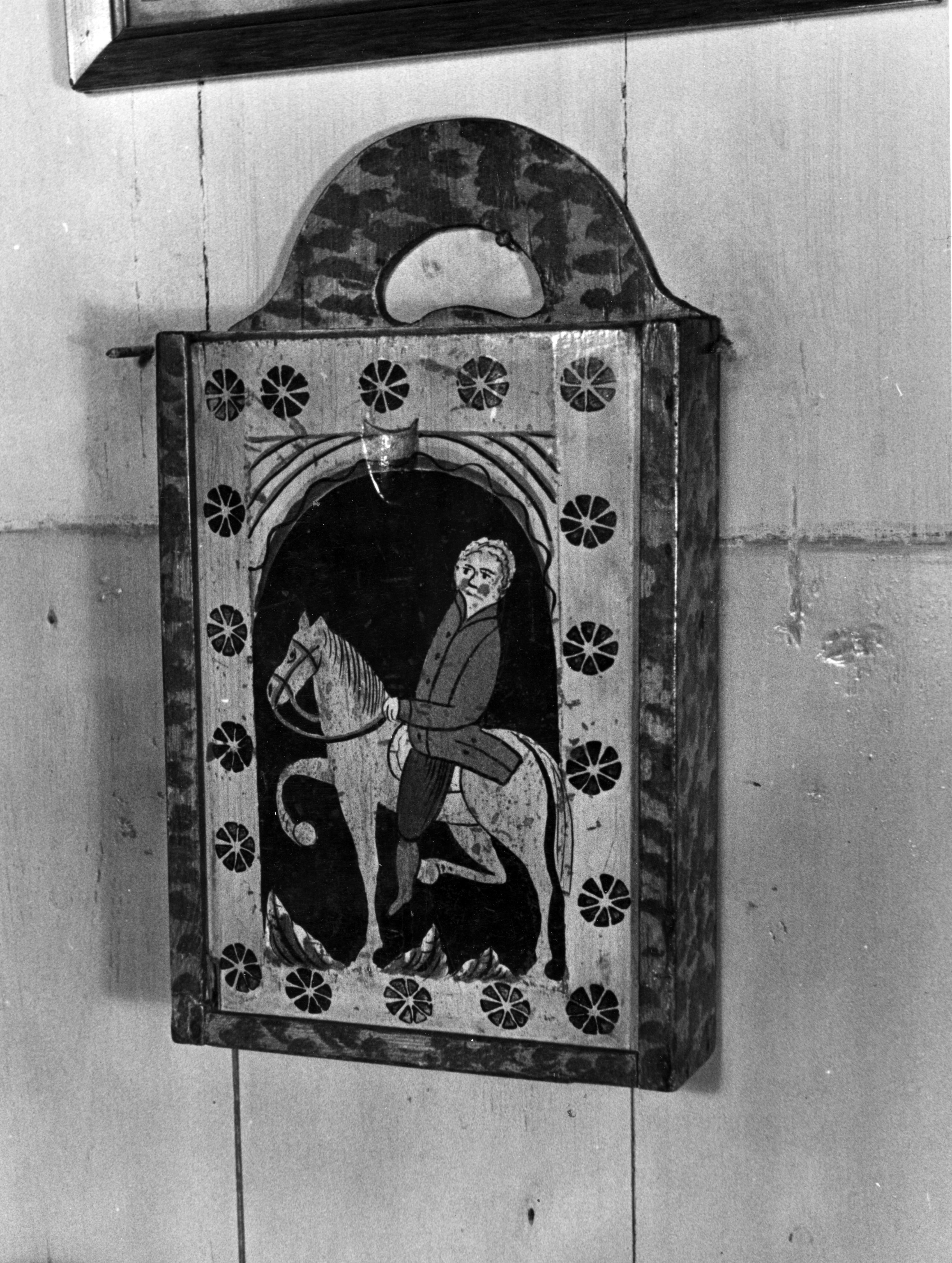Beschilderde houten schooltas, gefotografeerd op Marken. Op de schuifdeksel staat een voorstelling van een ruiter te paard.