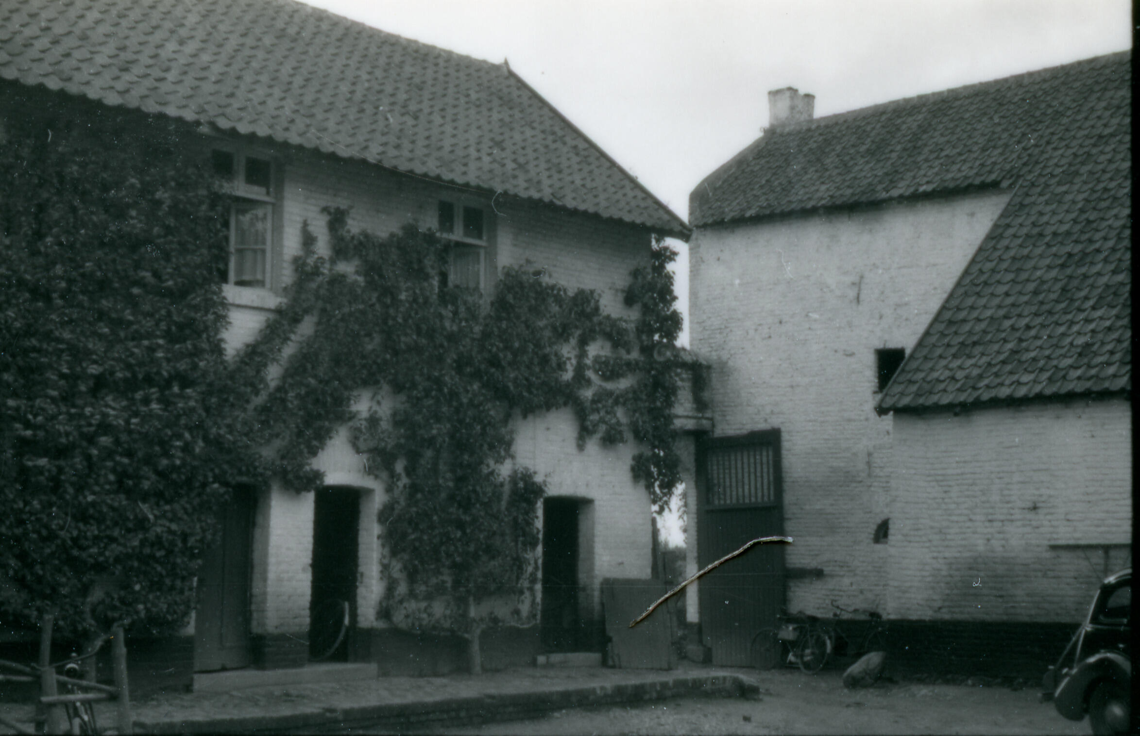 Binnenplaats van een vierkantshoeve, Maasbracht, 1940 (zwart-wit foto)