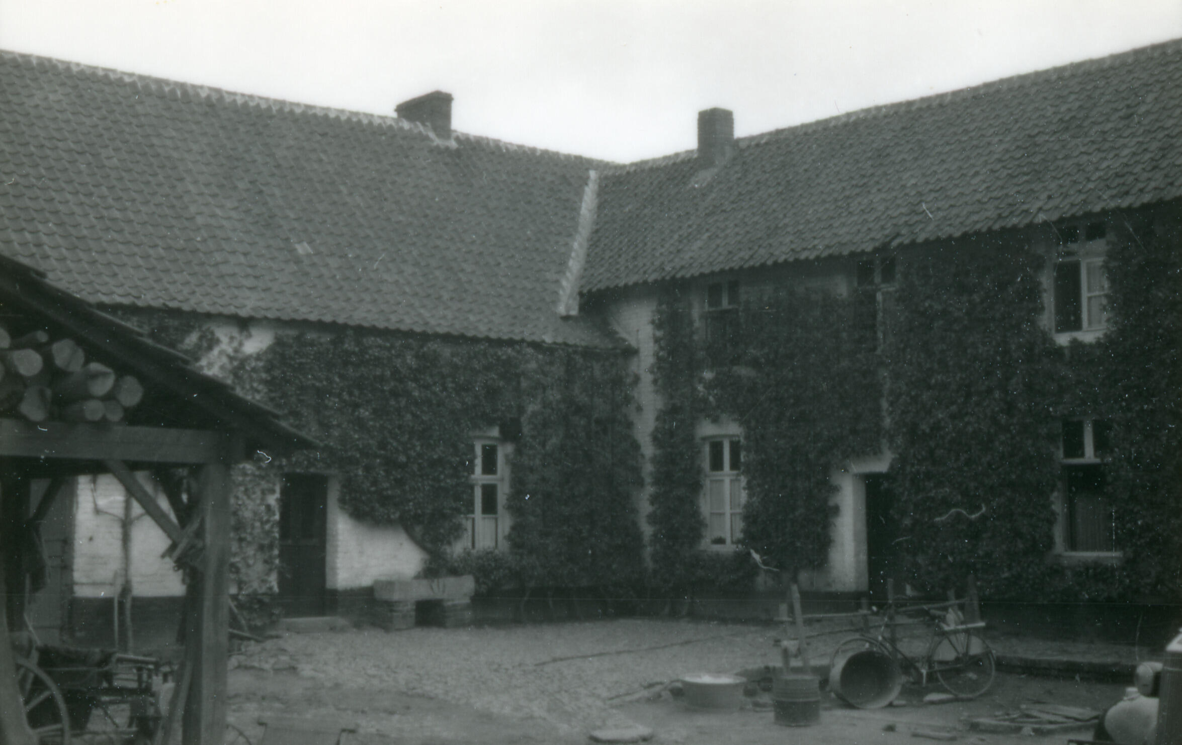 Binnenplaats van een vierkantshoeve, Maasbracht, 1940 (zwart-wit foto)
